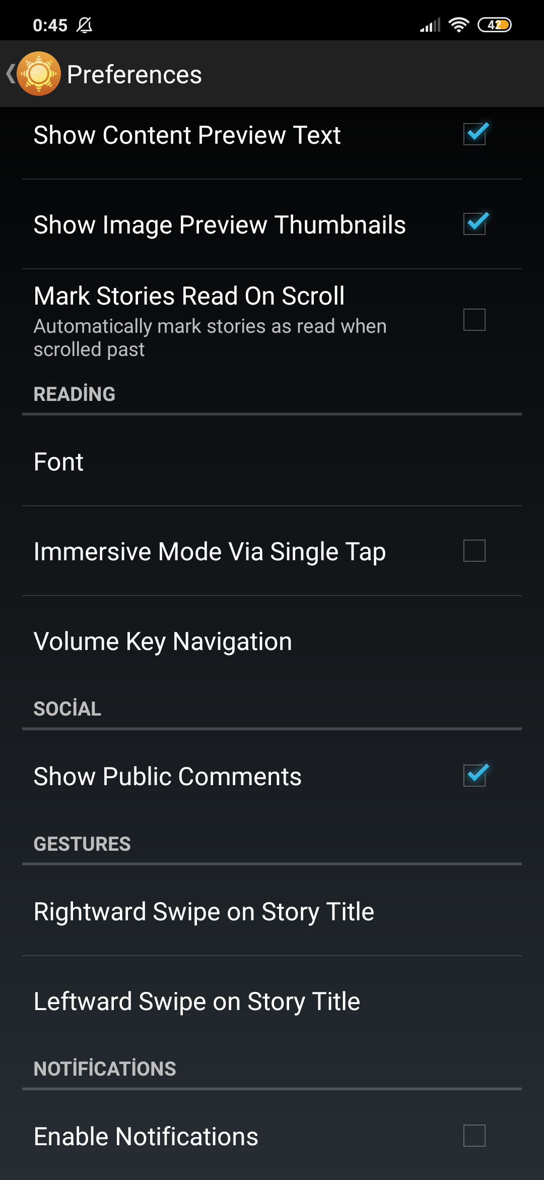 My favorite feature in the settings is Volume Key Navigation. With this feature, you can switch to the next story without touching the screen with the physical Volume Up / Down buttons.