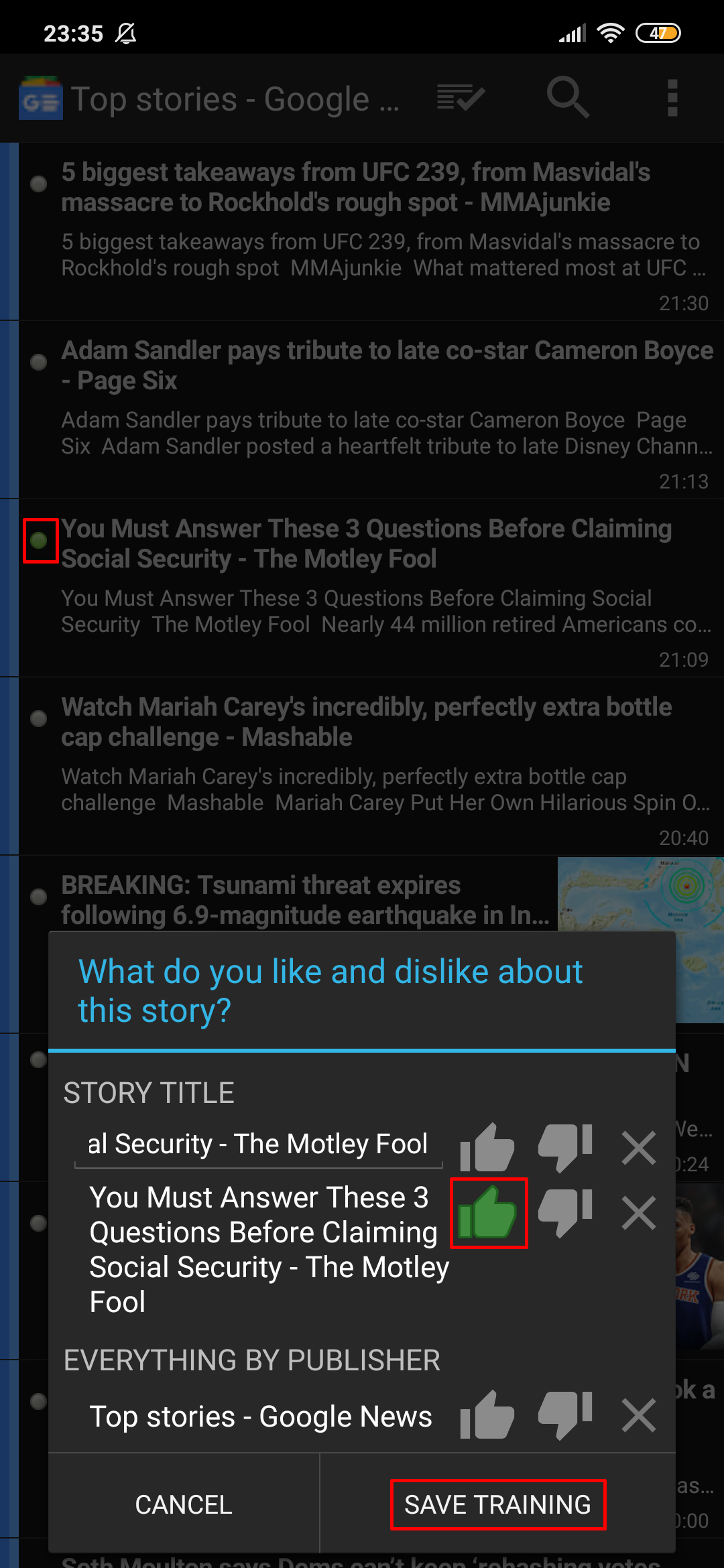 If you evaluate the story as positive for the entire publisher, all the stories in the feed will appear in the green dots: