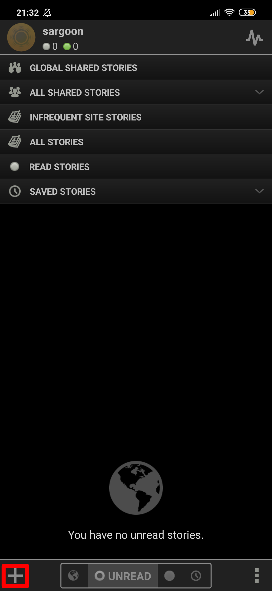 When you click the plus icon at the bottom left, you can search for a term or feed URL, and subscribe to any feed. All feeds you subscribe to will appear on the home screen: