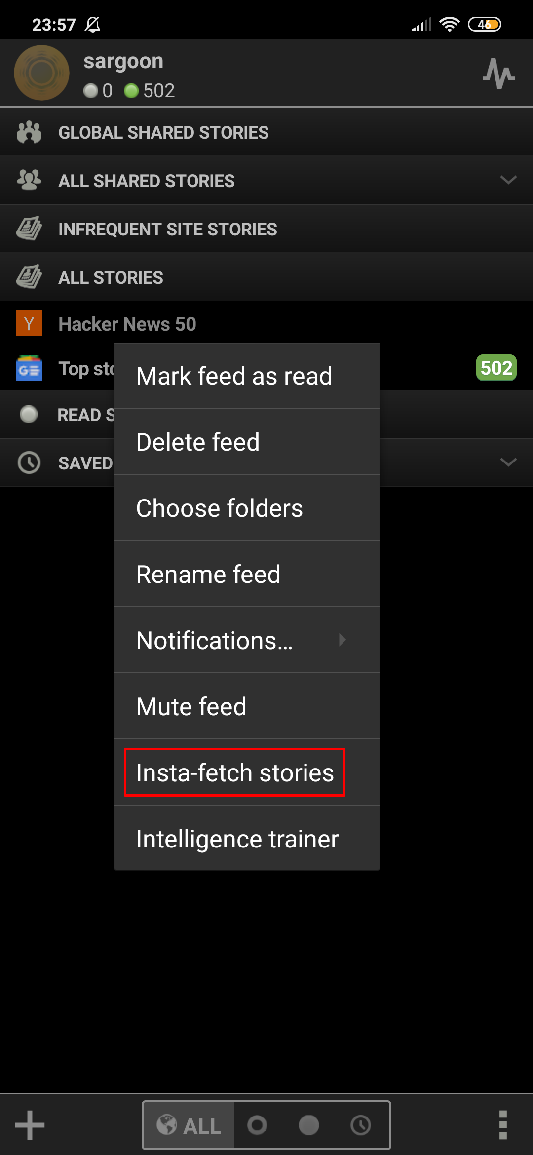 This is my favorite feature of NewsBlur application. With this feature, I can save all the stories of my subscribed story feed in a few seconds!