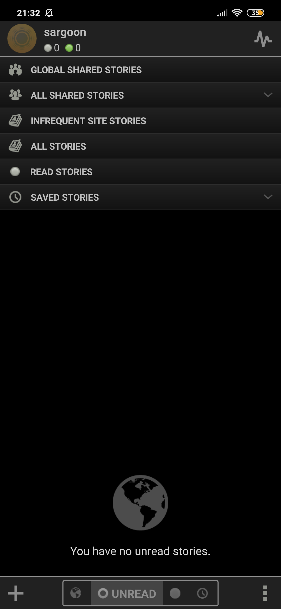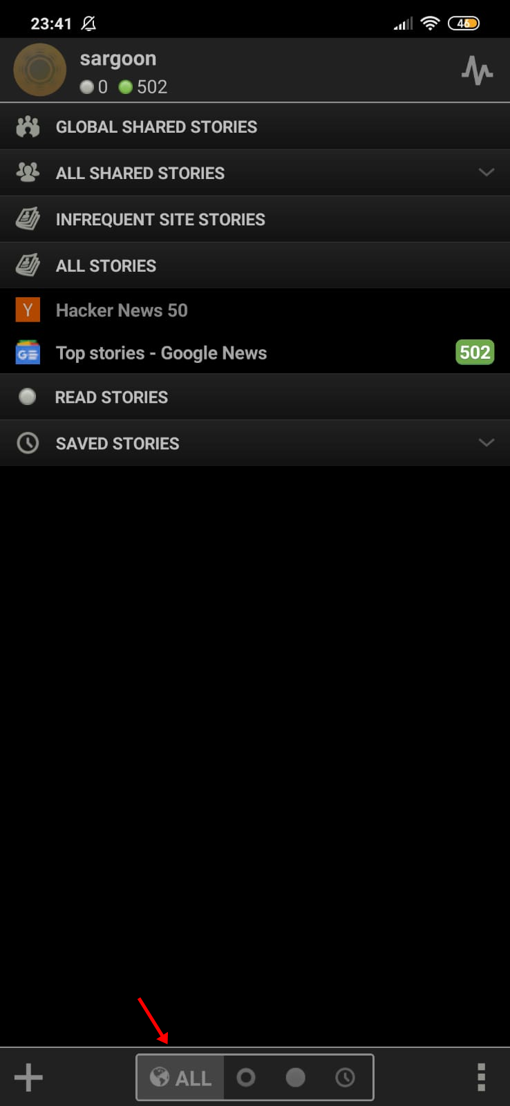 ALL: It allows you to see all the stories you subscribed to, story feeds, stories you haven't read yet, stories you have saved, or stories you have evaluated positive (thumbs up) or negative (thumbs down).
