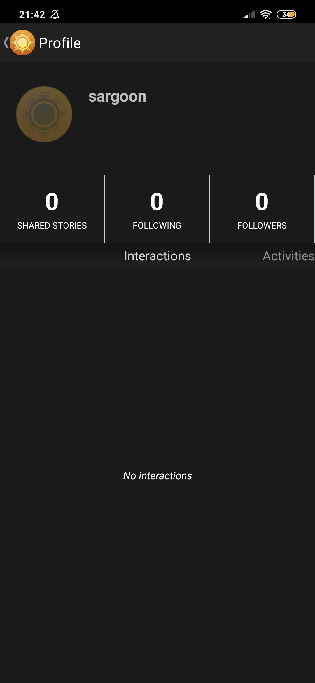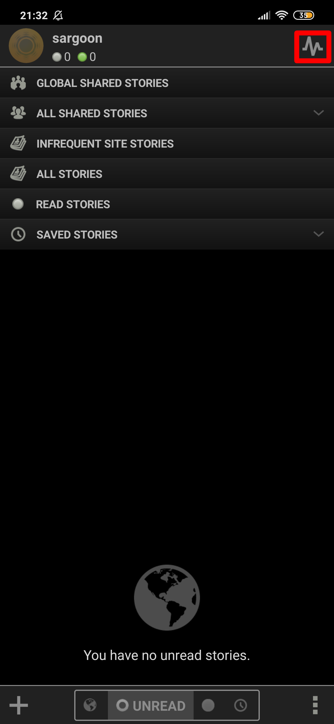 On the home screen, the icon at the top right shows your newsblur profile. (your interactions, activities, followers, following, shared stories):