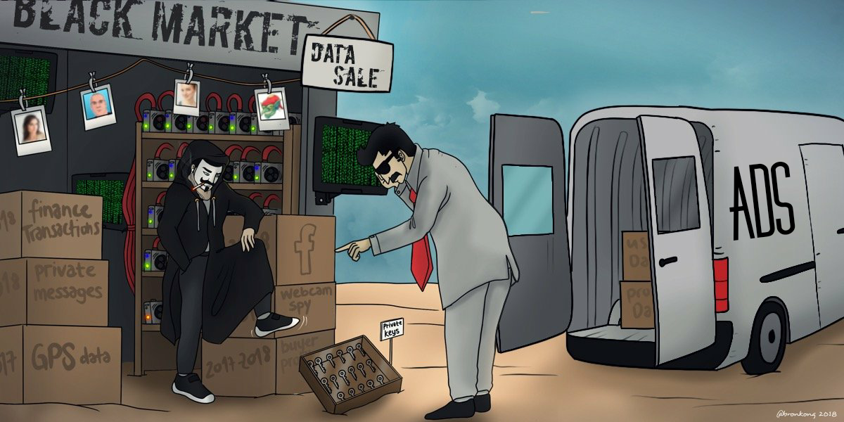 We were struck by this beautiful illustration by @ferjart. The scene cleverly depicts 0's trading user data with 1's. It's a shady scene that we know all too well these days! Browsers, apps, and credit cards are all dealing your data and making a tremendous profit off of it.