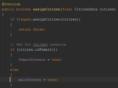 Those huts are now trying to spawn children periodically if a male and a female citizen are living there and the colony is not maxed out. To check whether the parents are present the citizen hut simply remembers them upon moving in: