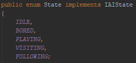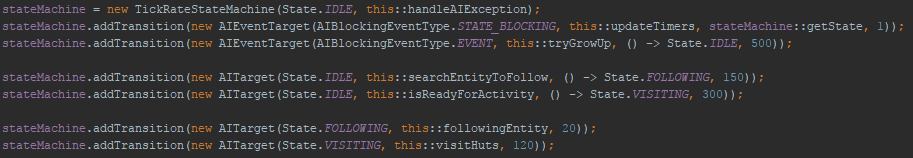 Finally the children need some activities so we're adding a childAI to them. For AI's we're using a state machine, which I'll explain more about in a future post. For our AI we're defining states and transitions to use: