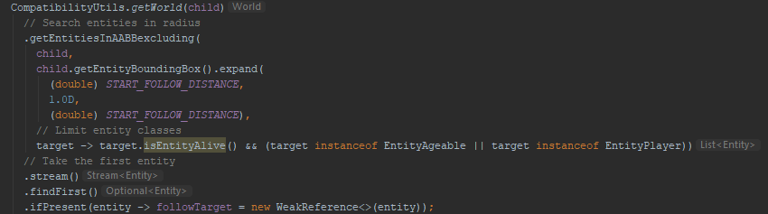 For following other entities we're checking entities around the child every 150 game ticks. The check happens in a simple box radius around the child entity, and is not executed too often to not affect performance much.