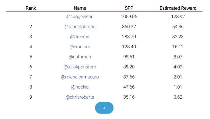 10% of the total SPP earned during the week by all SPP users will be distributed as a bonus to the 10 top users in a non-linear manner.
