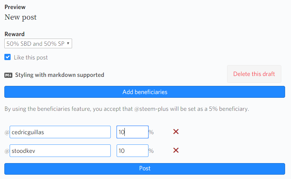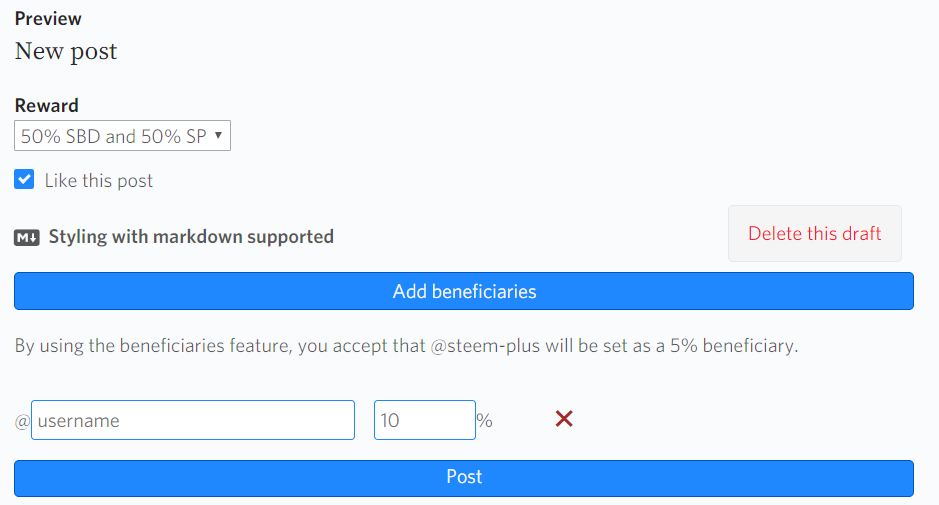 - Option to add beneficiaries to your post (you can say that 10% of your post payout will go to one of your friends for example) - 5% fee goes to SteemPlus if you use this feature.