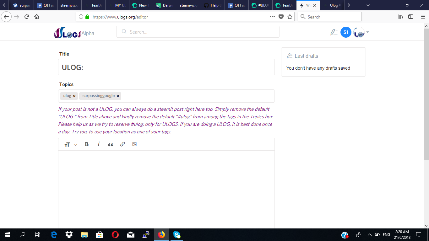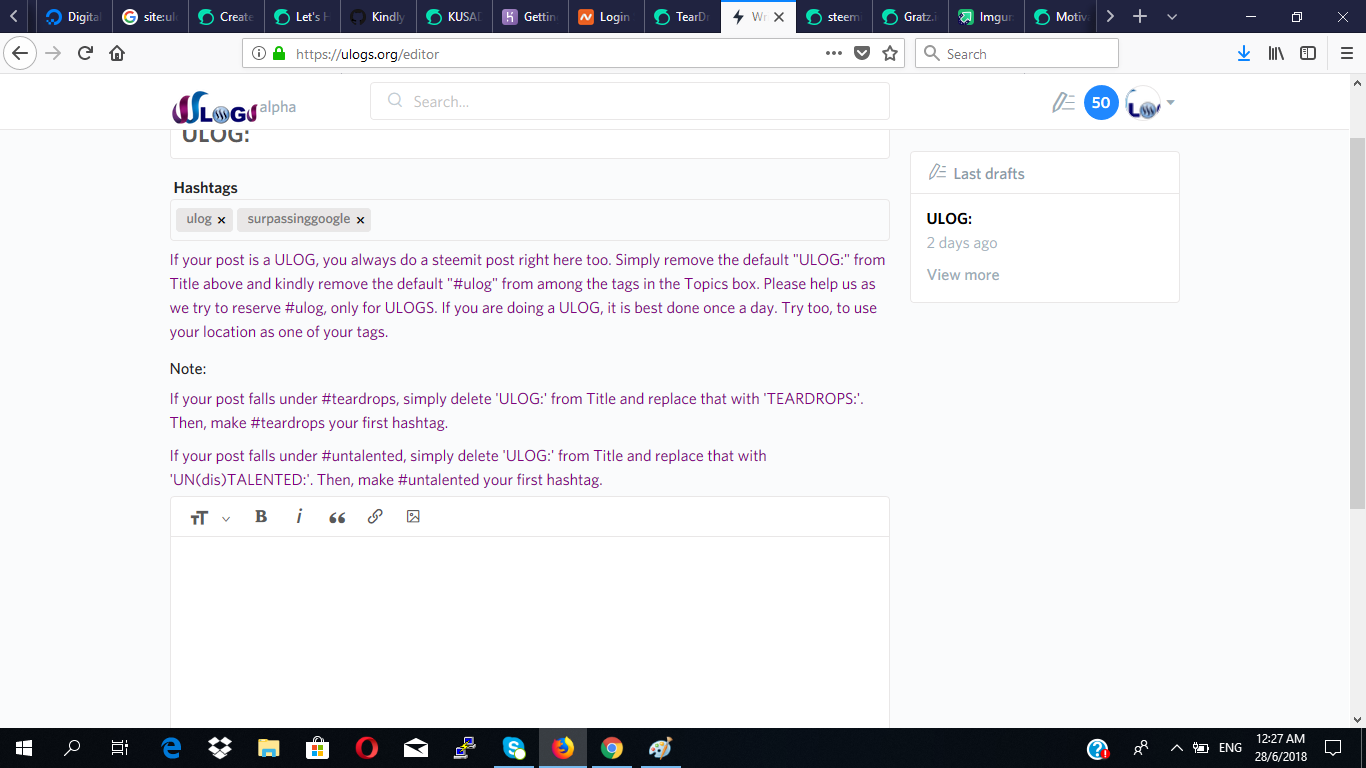 If your post is not a ULOG, you can always create and publish a steemit post right here too! Simply remove the default "ULOG:" from Title above and kindly remove the default "#ulog" from among the tags in the Hashtags box. Please help us as we try to reserve #ulog, only for ULOGS. If you are doing a ULOG, it is best done once a day. Try too, to use your location as one of your hashtags.