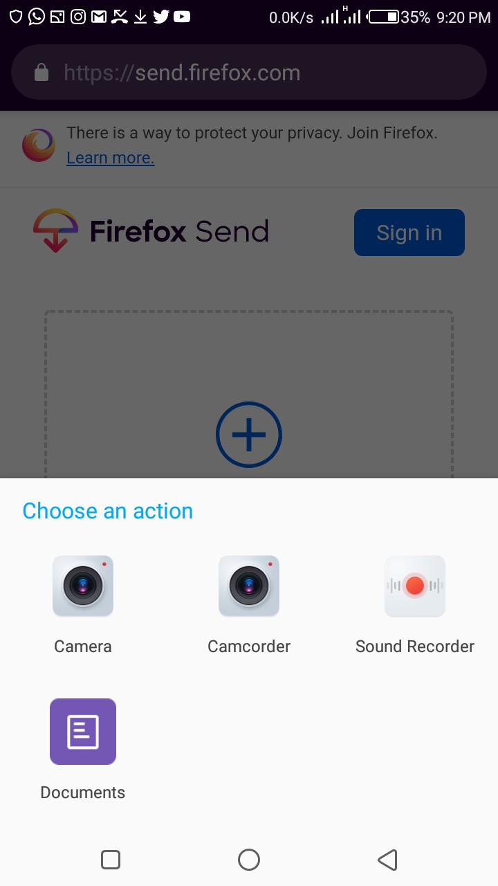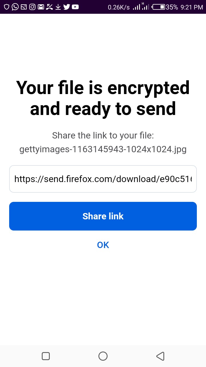 Firefox send is a sharing service or a sharing device that you could use to send encrypted documents through a personal hyperlink which you control. It's certainly a manner of setting limits to how long your documents or datas lives online.