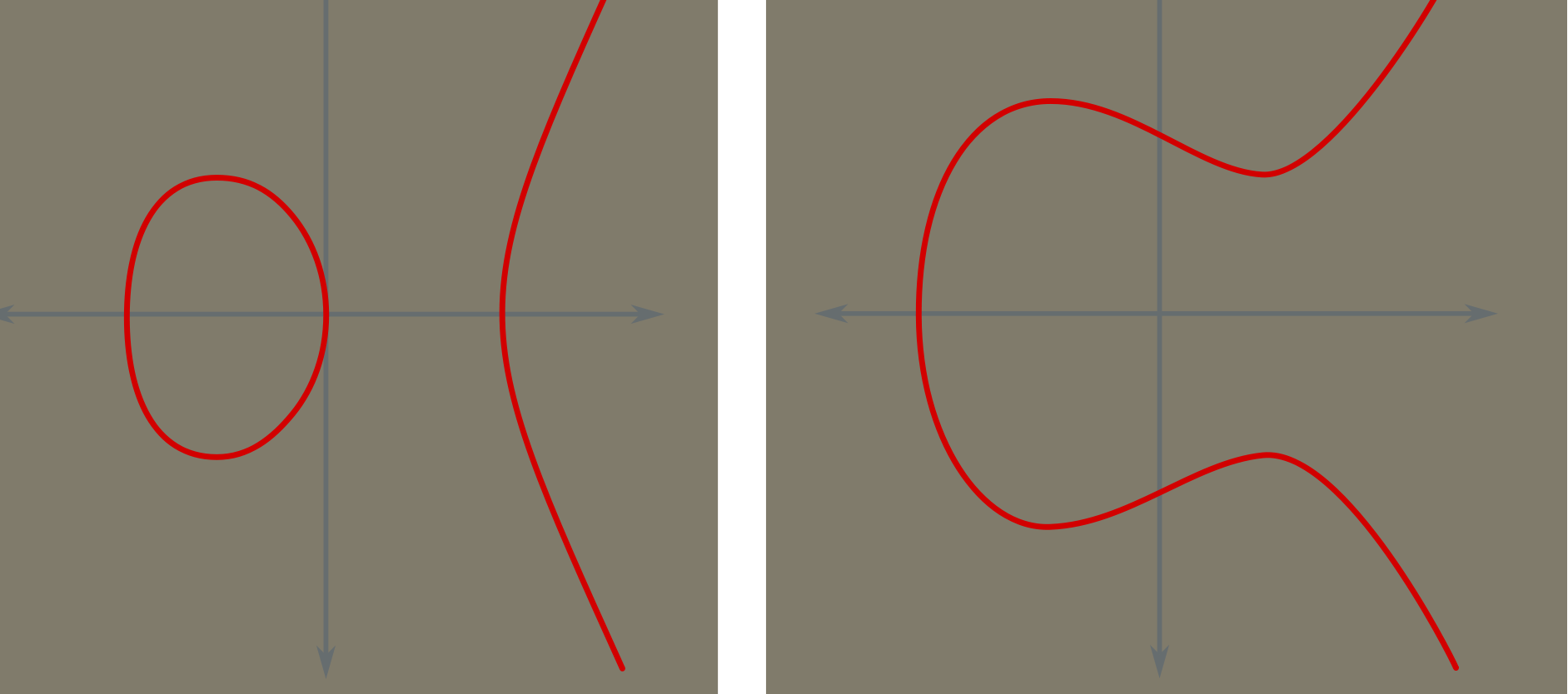 An elliptic curve is a mathematical curve that can come in various different forms as seen in the image above. In the Blockchain, the Private Key uses data from a random number between 0 and 2^256 and this number is stored as bytes. This number along with a random point on the selected elliptic curve are used to create the Public Key. The random point acts as the starting point and then we choose a new random point on the curve again and again until we've chosen a sum total of points that equals the number that represents the Private Key. This is a process called Elliptic Curve Multiplication. The final coordinate is used to build the Public Key; with the X and Y values being converted into bytes and concatenated together.