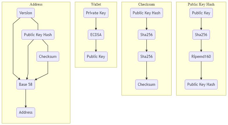 The image above shows various flowcharts for converting the Public and Private Keys into necessary components for our blockchain. The Private Key is passed through the ECDSA or Ecliptic Curve Digital Signing Algorithm to create the Public Key. This Public Key can then be passed through a Sha256 256 bit hashing function and the result of this action is then also passed through a Ripemd160 160 bit hashing algorithm. This produces the main Public Key Hash which is used to create the address as well as the checksum. The Public Key Hash is passed through two Sha256 256 bit algorithms to create a new Hash and then the first 4 bytes/8 characters are stripped from that hash; these 4 bytes are the Checksum. The Checksum is combined to the Public Key Hash and the Version byte and then the resulting data is passed through a Base58 encoding algorithm to create the Address for this wallet. Unlike a hash function, the Base58 Algorithm, can be reversed to facilitate various features in the blockchain.