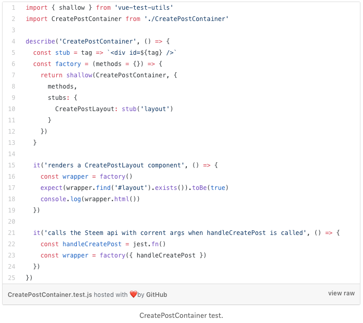 And of course, a test. We just want to make sure <CreatePostLayout> is rendered. When we fill out the logic for handleCreatePost, we will update the test.