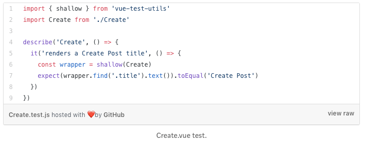 Let’s write a quick tests for Create.vue, the component we just created. In src/views/posts/Create.test.js, write the following test: