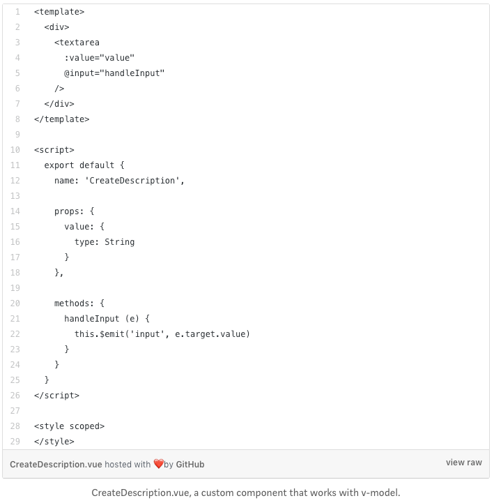 We want this component to work using v-model, so we can write the final markup in CreatePostContainer like this: