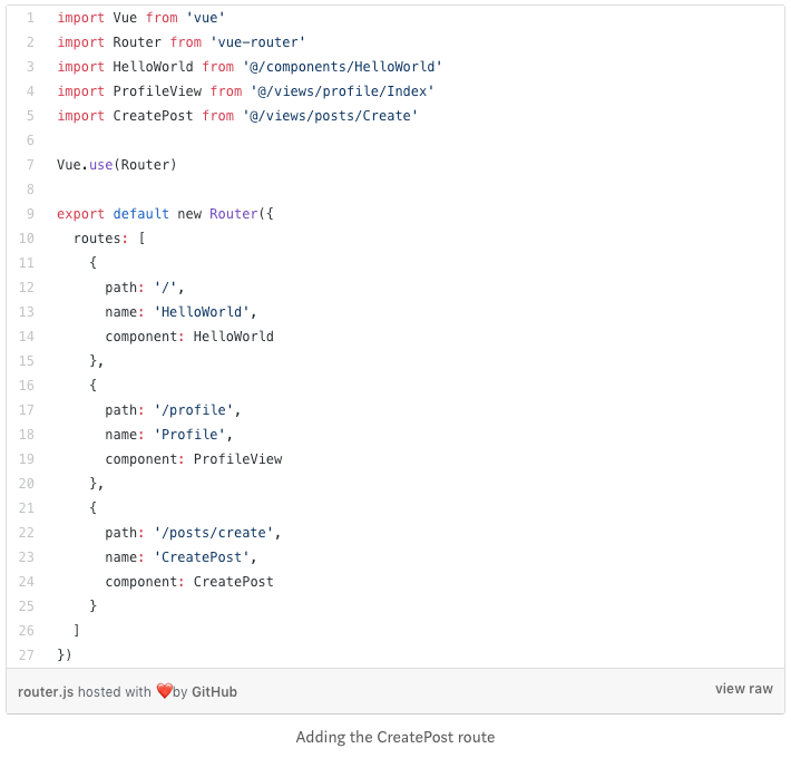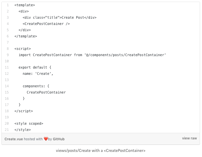 CreatePostContainer.vue is pretty simple as well. Here it is: