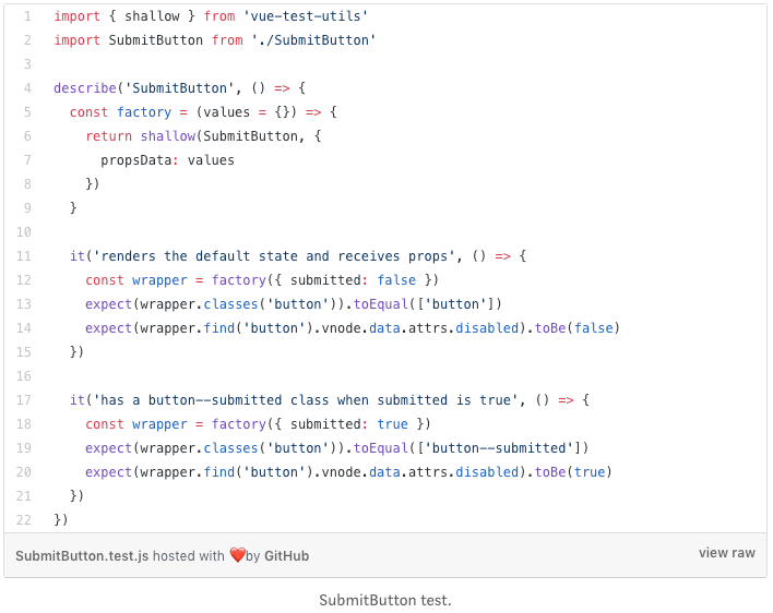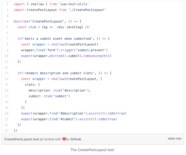 We have covered event testing already. More information about slots and vue-test-utils is here. The test is pretty straightforward. Notice the neat stub helper function on line 5, which saves us some duplication when creating the slots.