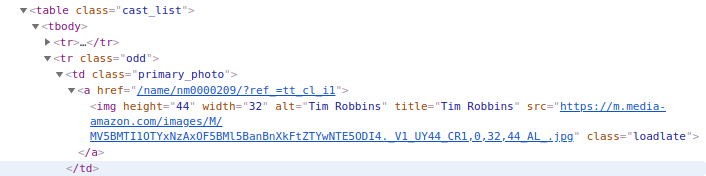 Casts = tree.xpath('//table[@class="cast_list"]/tr/td[@class="primary_photo"]') # [<Element td at 0x7fee28ed97e0>, <Element td at 0x7fee28ed9838>,....]