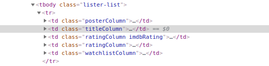 requestswhich returns a ElementTree. So that we can perform a global XPath query against the document.pageUrl = 'https://www.imdb.com/chart/top' page = requests.get(pageUrl) tree = html.fromstring(page.content) #<class 'lxml.html.HtmlElement'> MoviesList = tree.xpath('//td[@class="titleColumn"]') #[<Element td at 0x7f4a175decb0>, <Element td at 0x7f4a175ded08>,....]