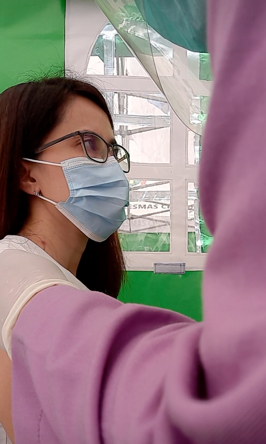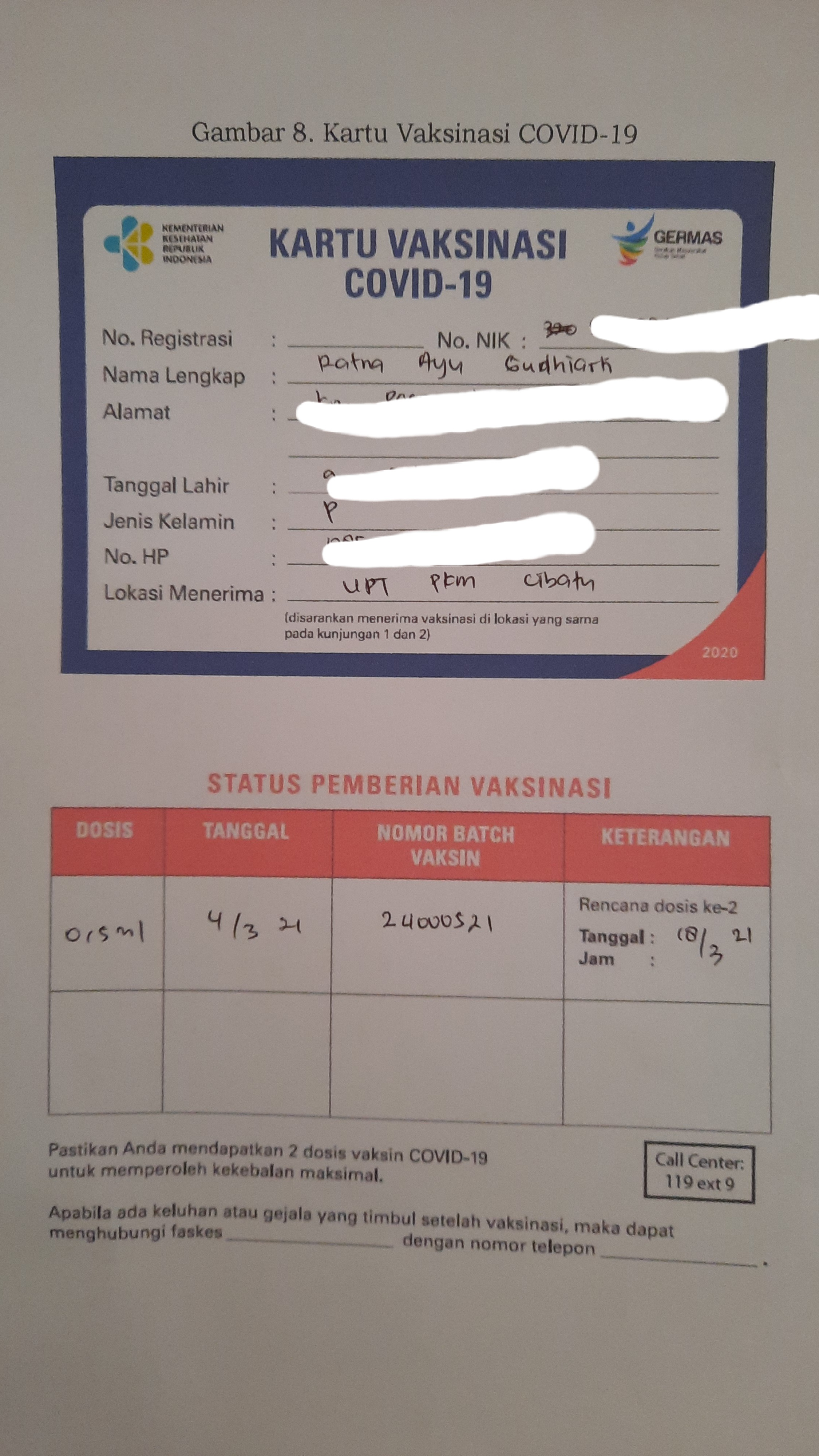 Kami yang mengantre, dipanggil satu persatu untuk didata pada meja pendaftaran, membawa eKTP dan kartu BPJS, kemudian pindah ke tenda berikutnya untuk dilakukan screening. Di sini, disuruh menjawab beberapa pertanyaan, di antaranya apakah dalam sebulan terakhir ini pernah sakit, apakah punya riwayat kontak dengan penderita covid, adakah keluarga yang terkena covid, pernah TBC atau tidak, apakah punya riwayat darah tinggi atau gula. Pengukuran tensi darah dan kadar oksigen dalam tubuh juga diperiksa. Setelah lolos screening, barulah masuk ke tenda pemberian vaksin. Dosis sebesar 0.5 ml disuntikkan ke lengan kiri. Sungguh cepat prosesnya, karena nakesnya gesit, nyaris tak terasa apapun. Malah rasanya lebih sakit digigit semut daripada suntikan ini.