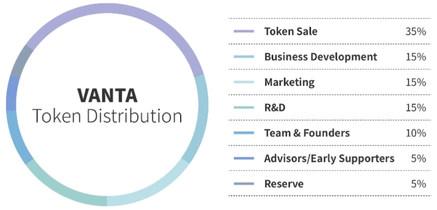 Токен VANTA (VNT)является полностью совместимым токеном ERC-20, но после запуска mainnet он будет заменен. Общий объем поставок составляет 56,2 млрд.