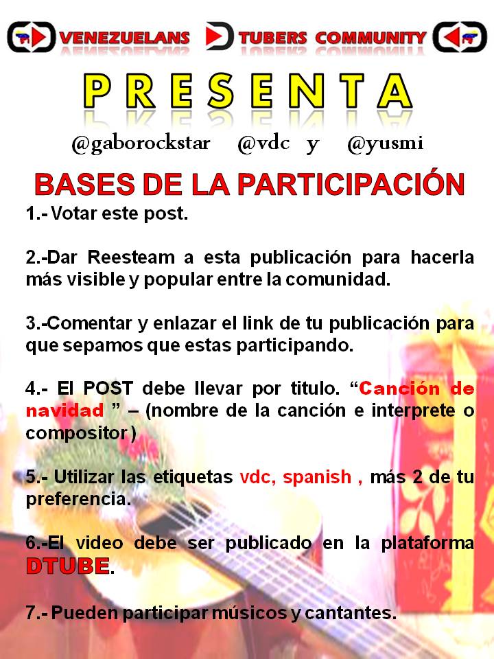 Hello friends, as an initiative to promote the @vdc community and make it more visible and known among the community, the first contest arrives: "Christmas Song" for musicians and singers of the Steemit platform. The bases of participation are very simple and here we leave them written in an image.