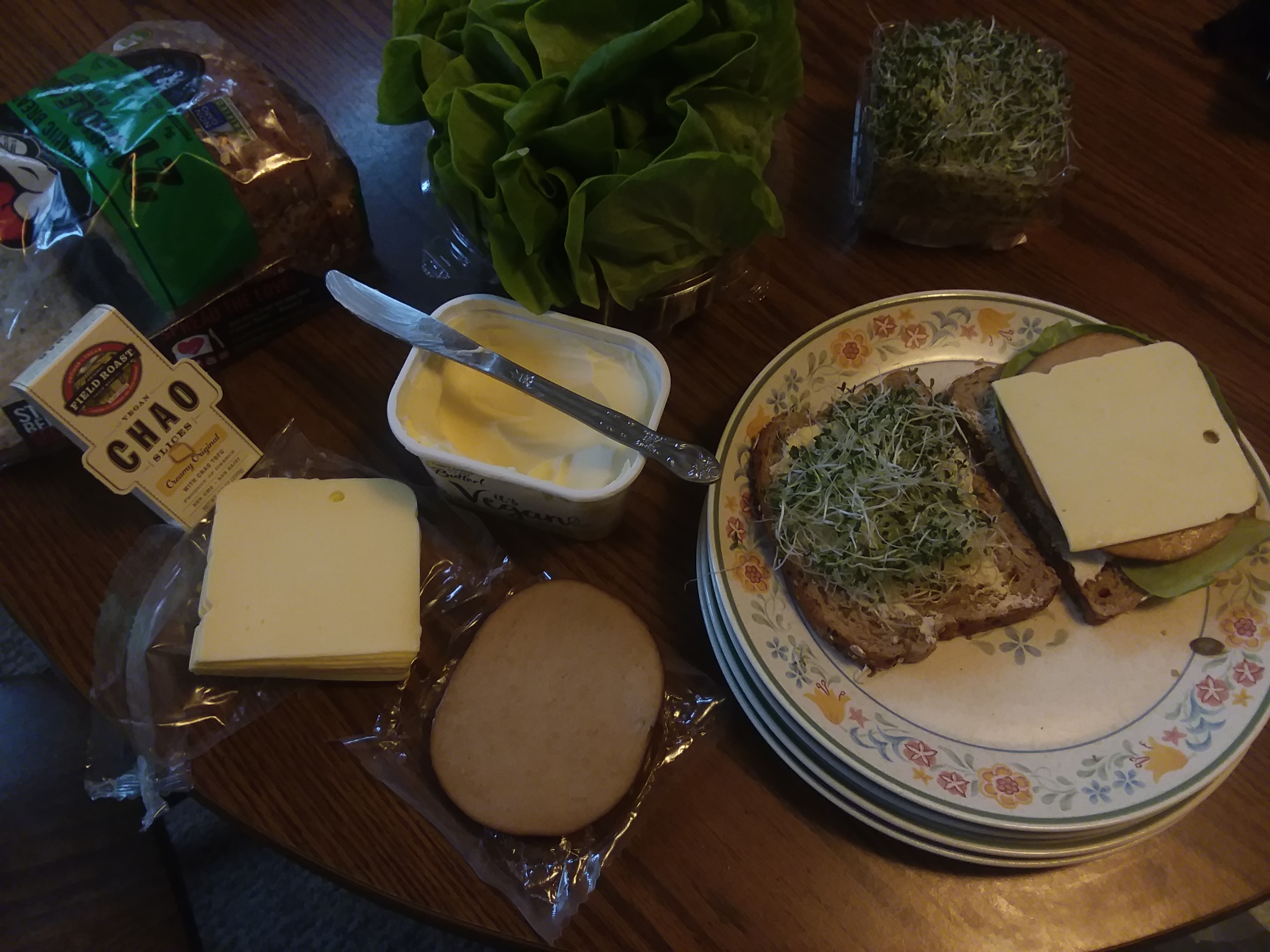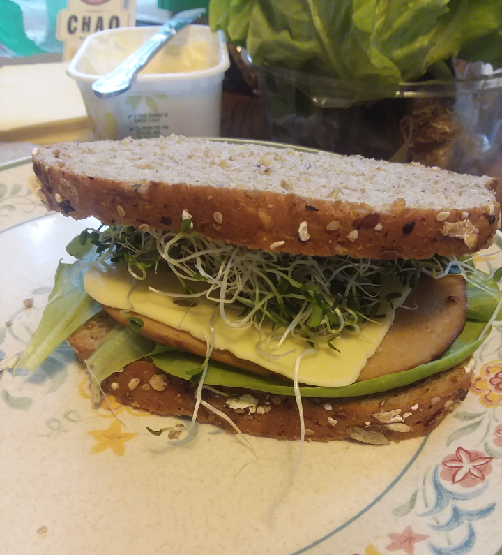 Tonight we did Tofurkey sandwiches! It had several slices of Hickory Smoked Tofurkey, coconut based Chao "cheese", I can't Believe it's Not Butter Vegan spread, alfalfa sprouts and butter lettuce.