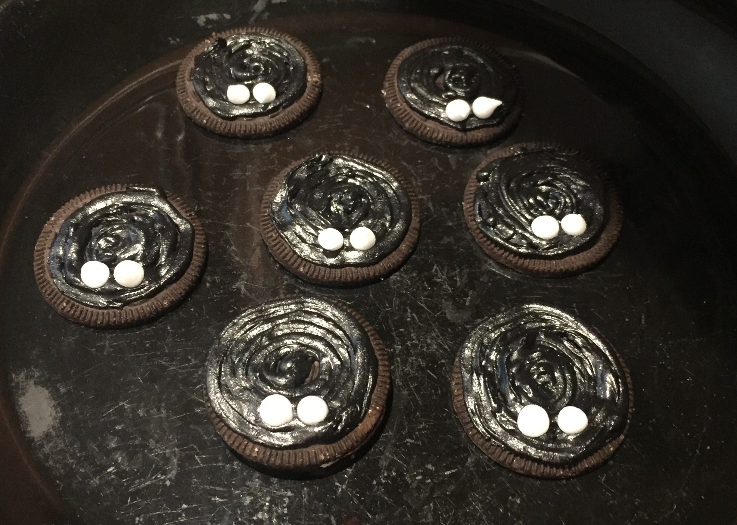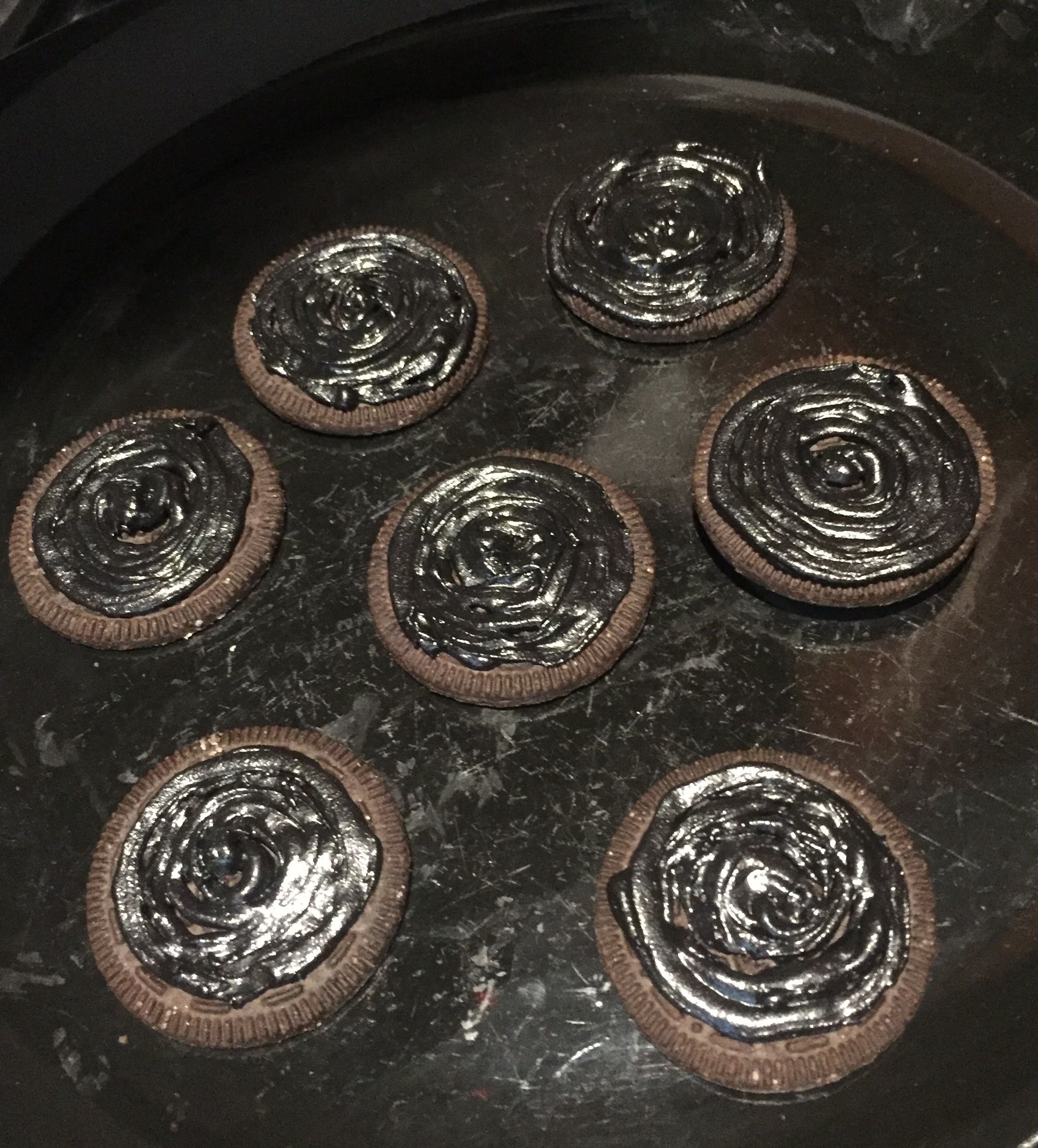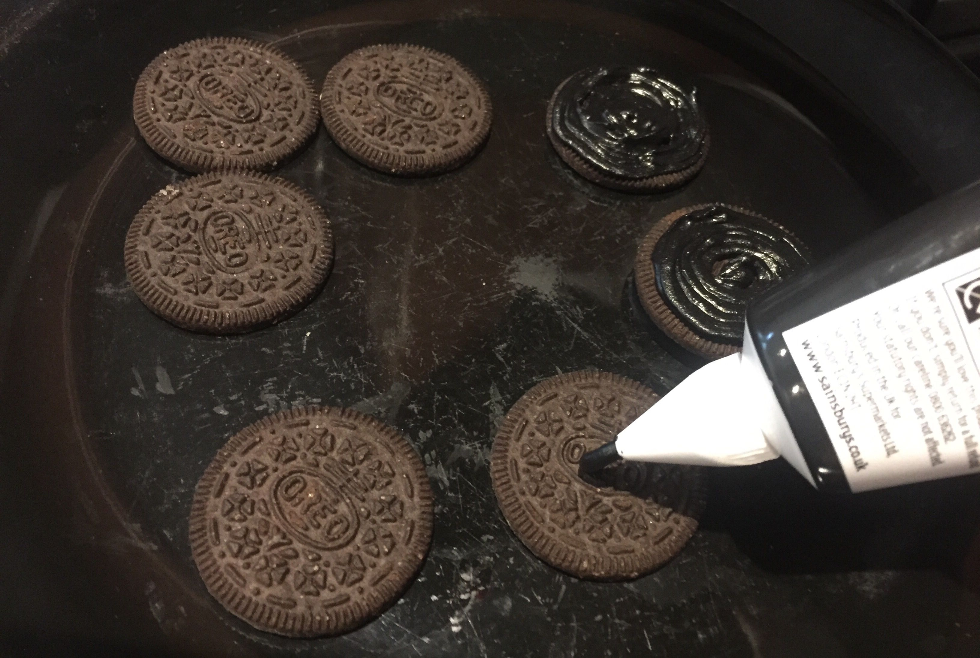 Use the black icing tube, or piping bag to colour the top of the Oreos black, starting from the middle and going out in a circular motion.
