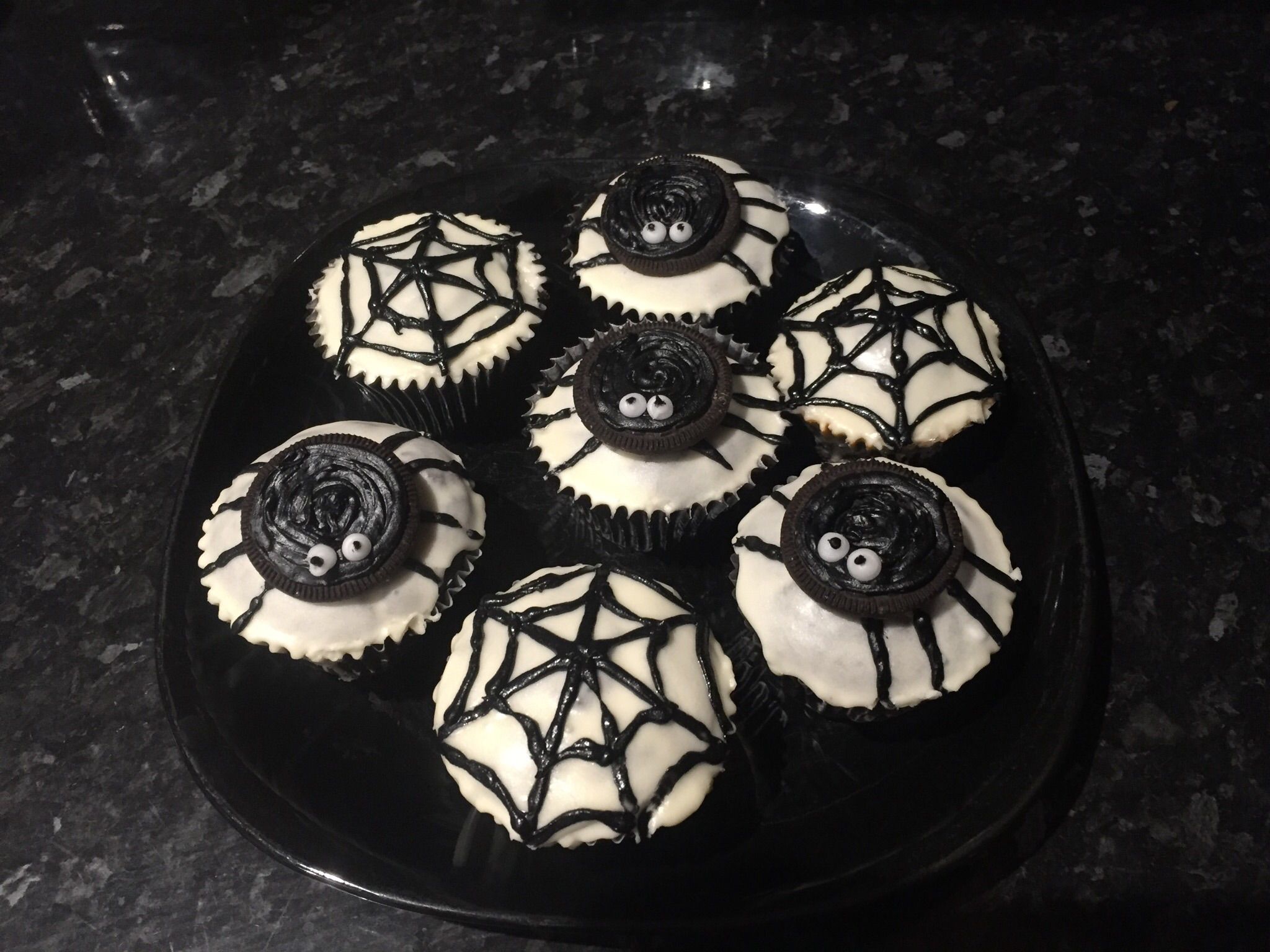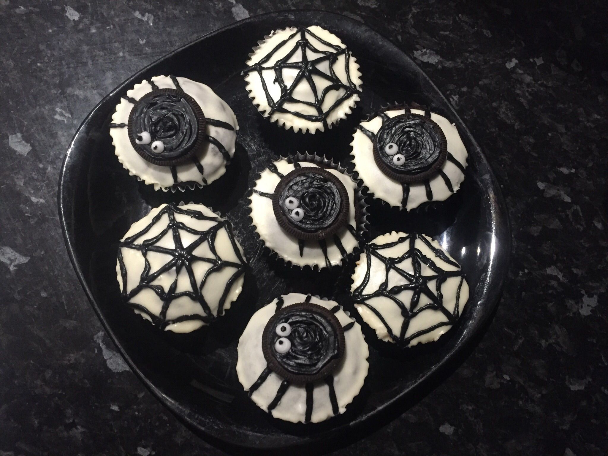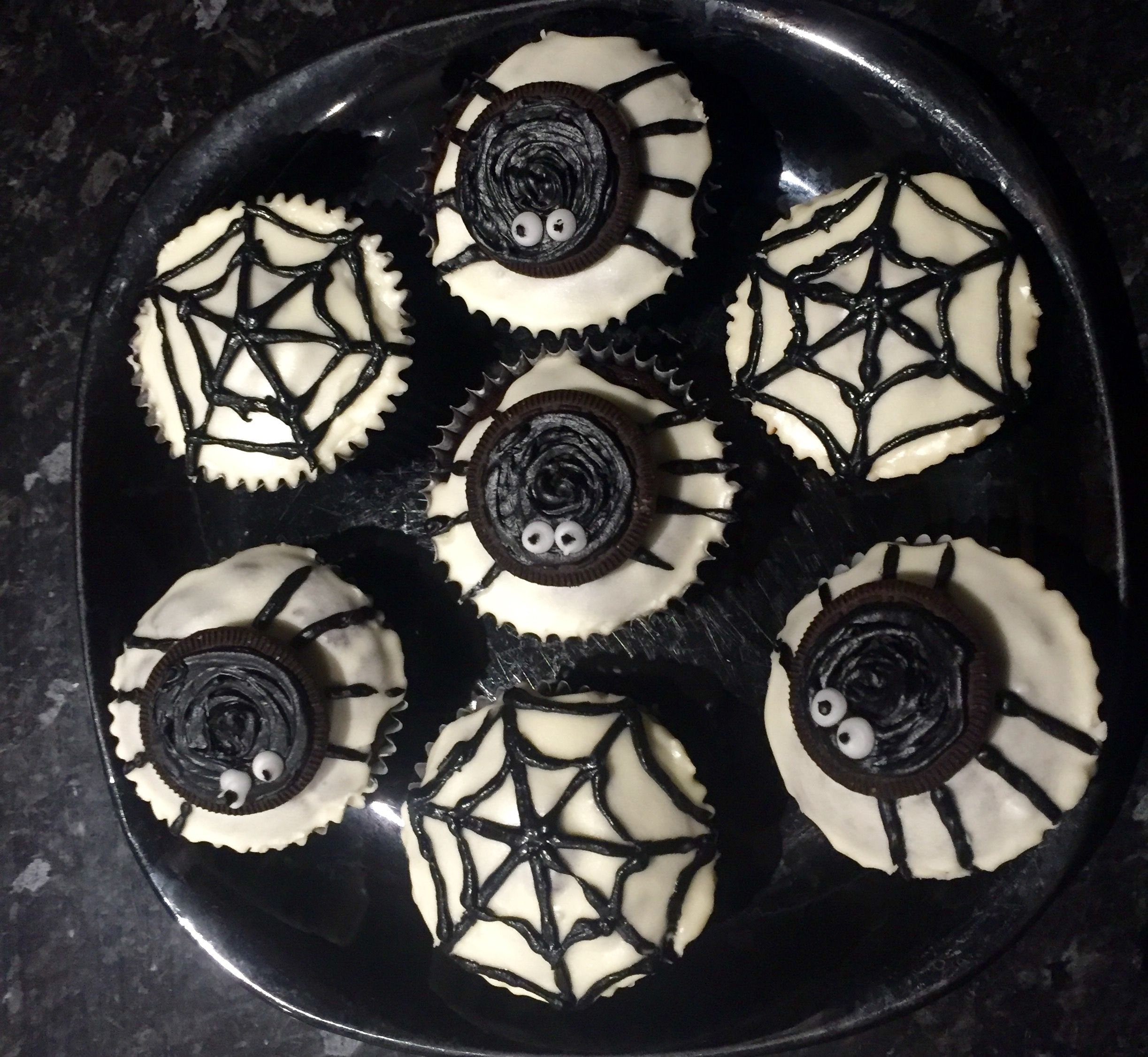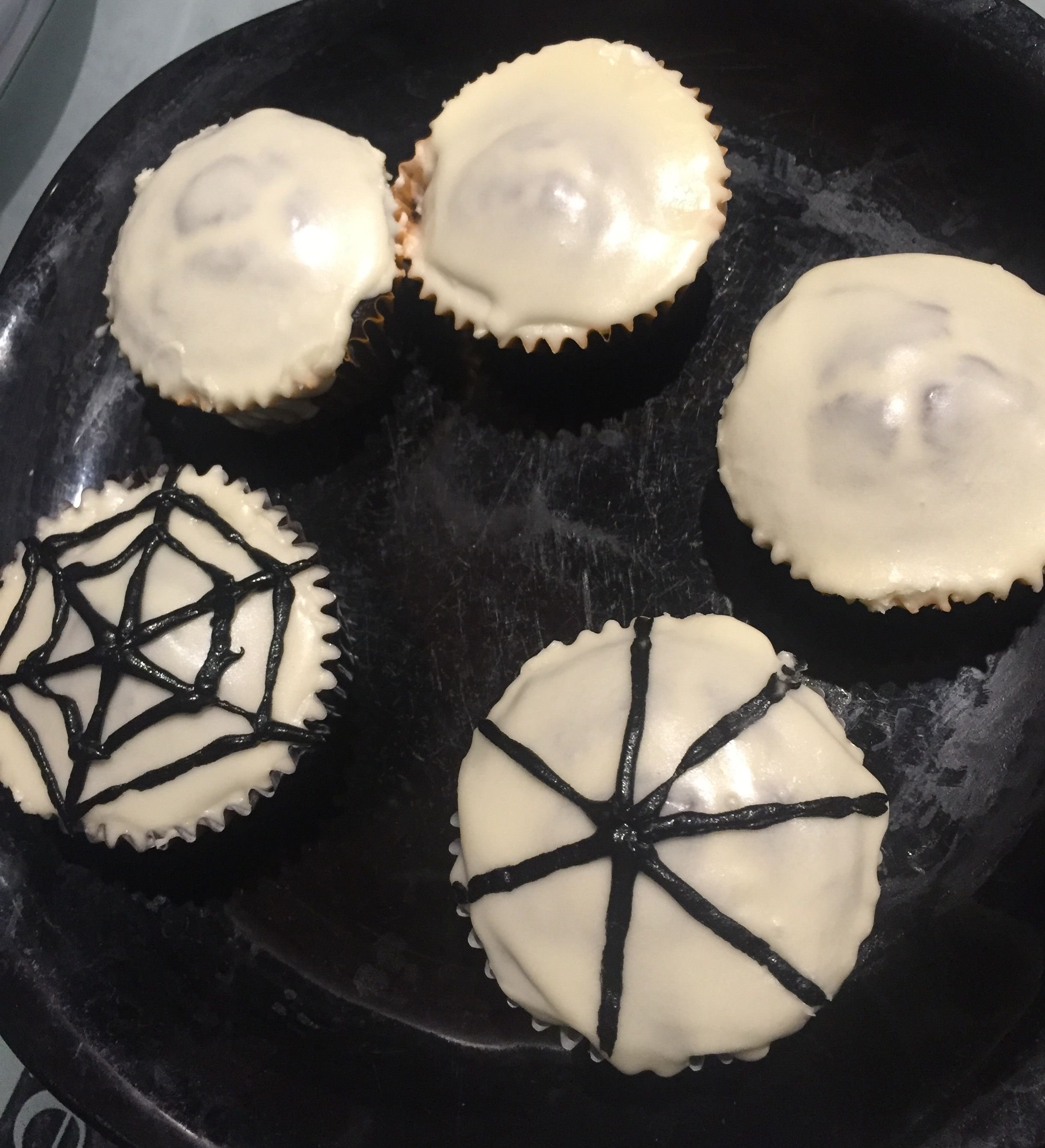With the remaining cupcakes, draw a spider web using the black icing tube.