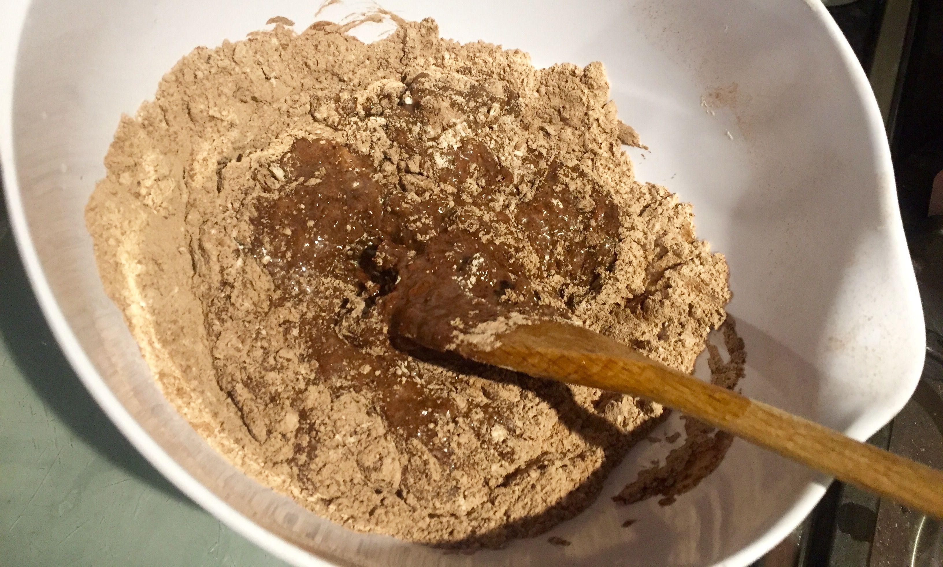 - Gradually add the wet mixture to the dry mixture, stirring well to eliminate any large lumps.