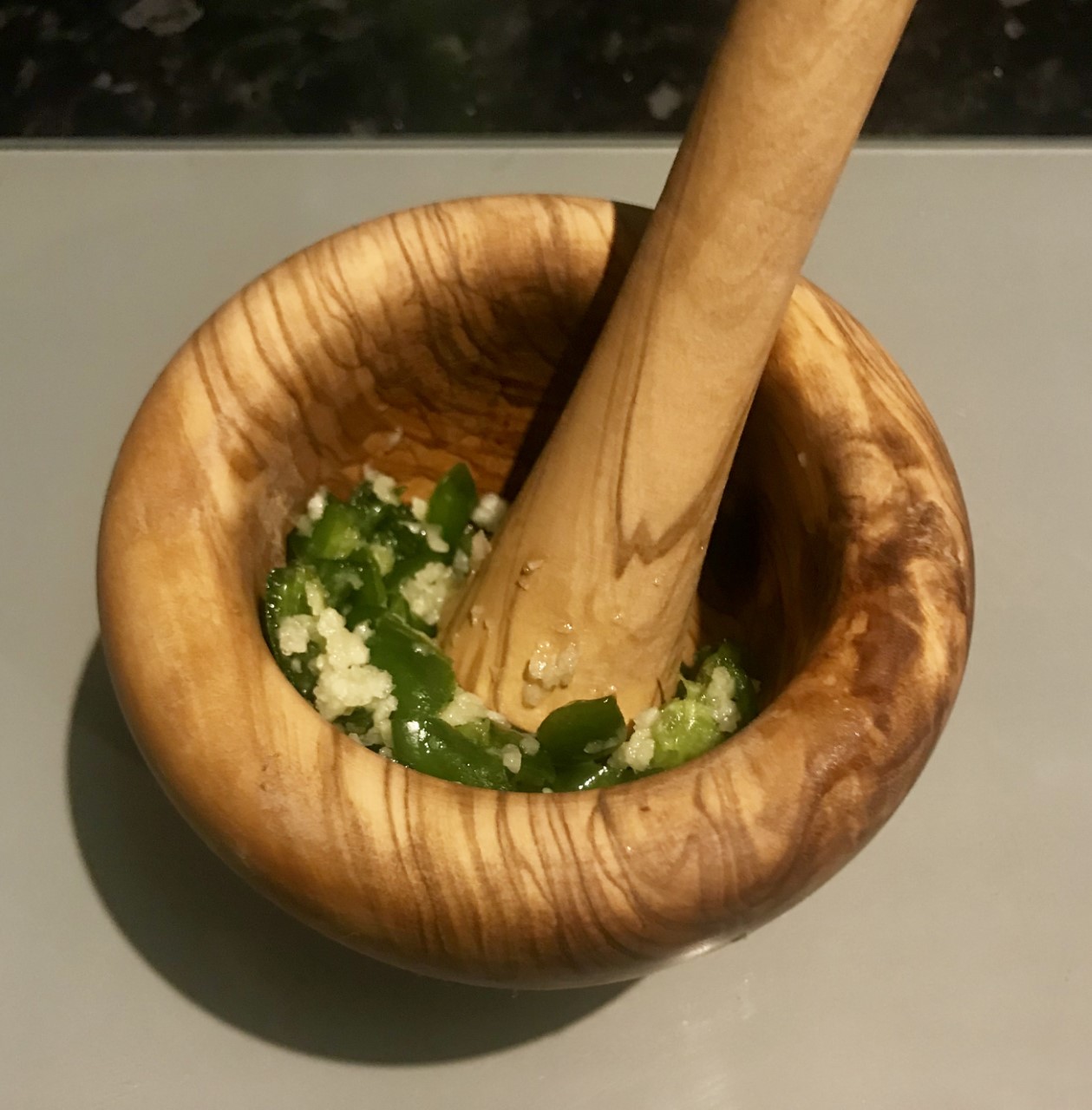 - Add the peppers and garlic to a mortar and pestle and crush into a chunky paste, or blitz quickly in a food processor.