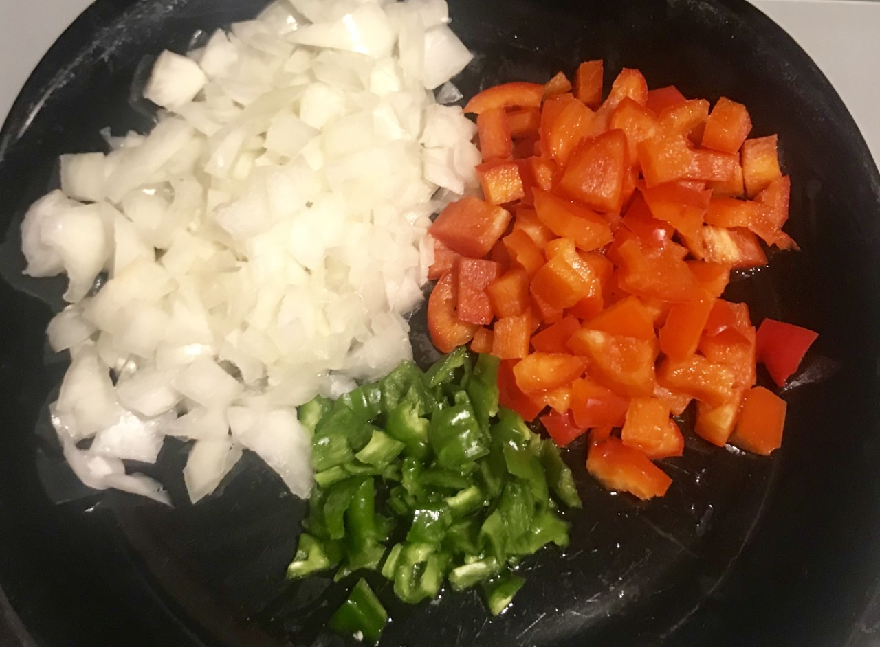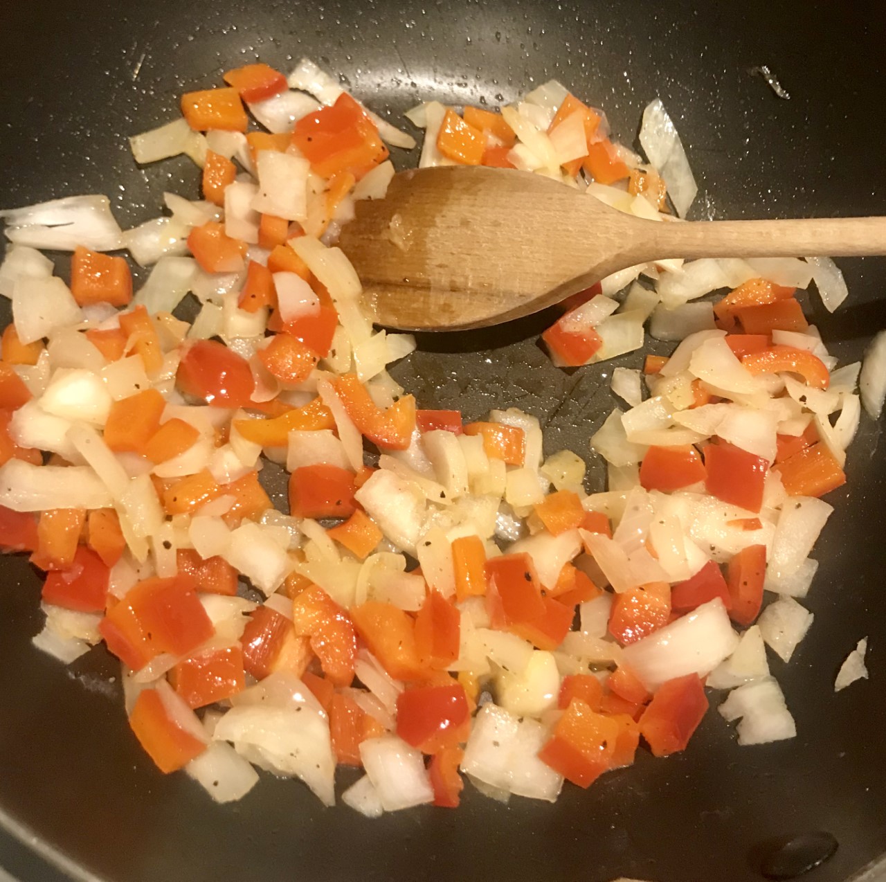 Once the oil is hot add the onion, and red pepper. Add a pinch of salt and pepper and stir. Sauté, stirring often for approximately 4 minutes.