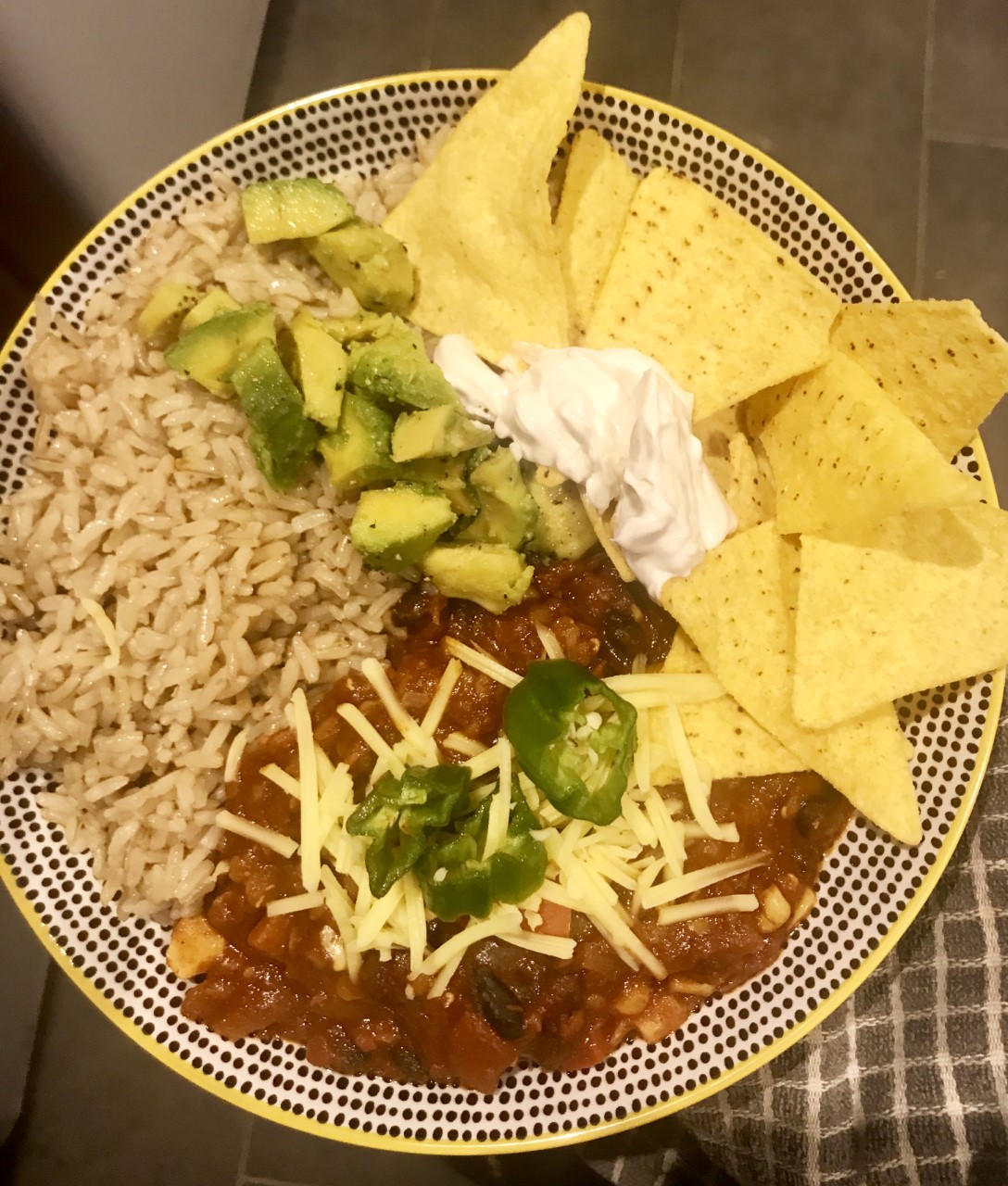 - Serve immediately with rice or quinoa, an avocado garnish, tortilla chips and vegan cheese and sour cream 😊