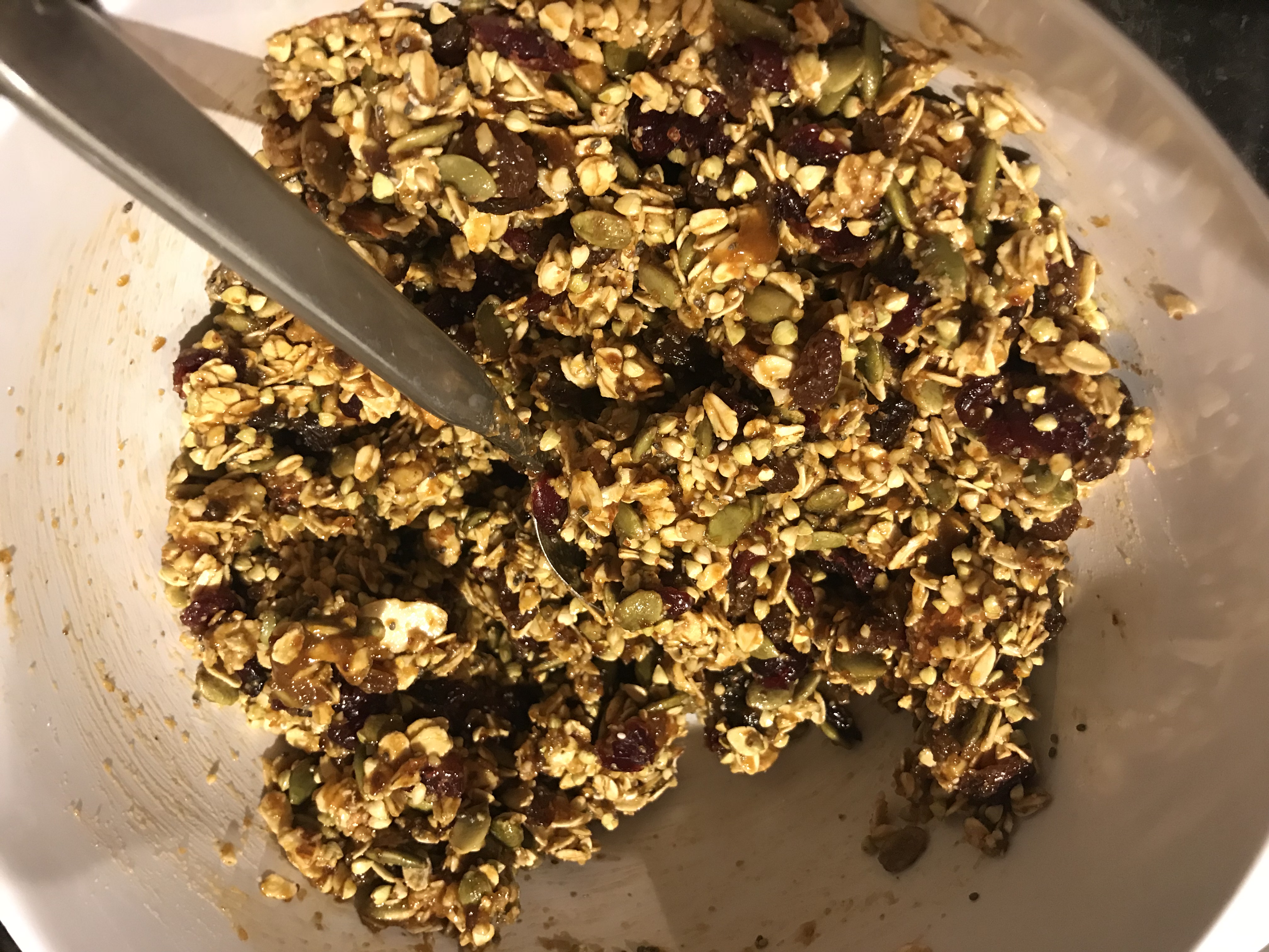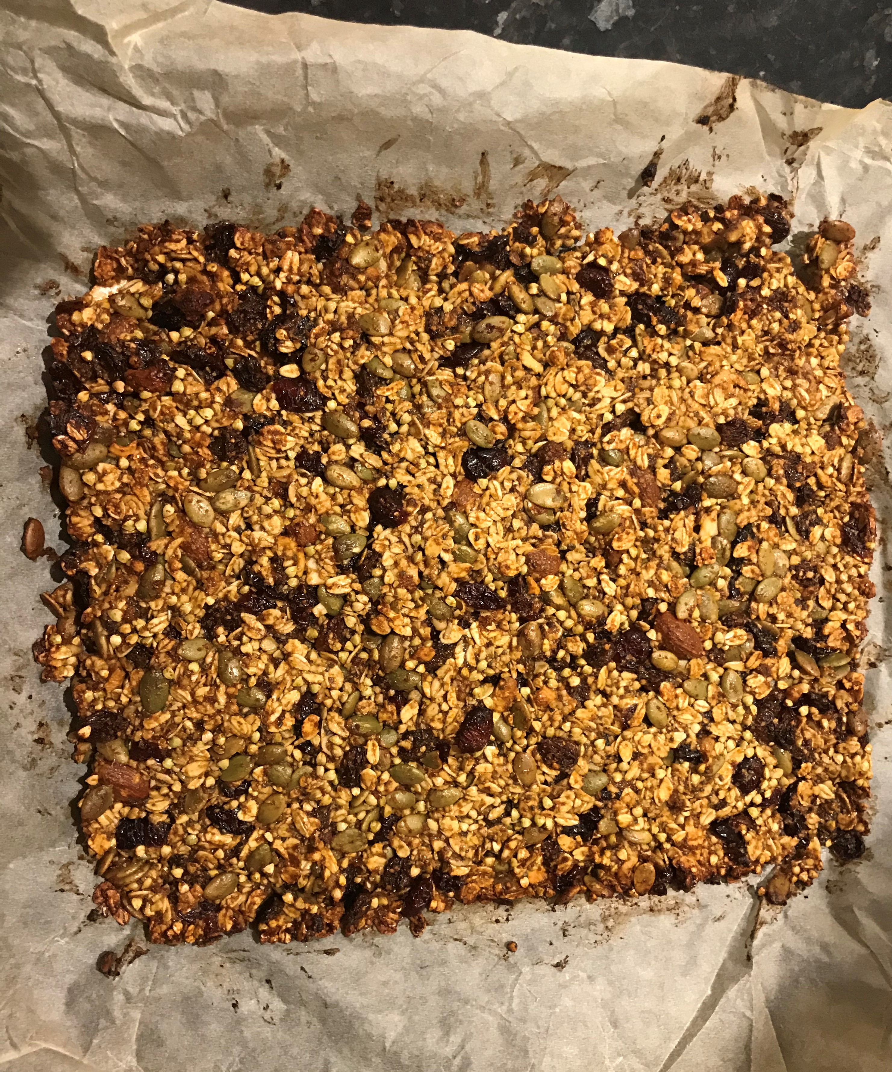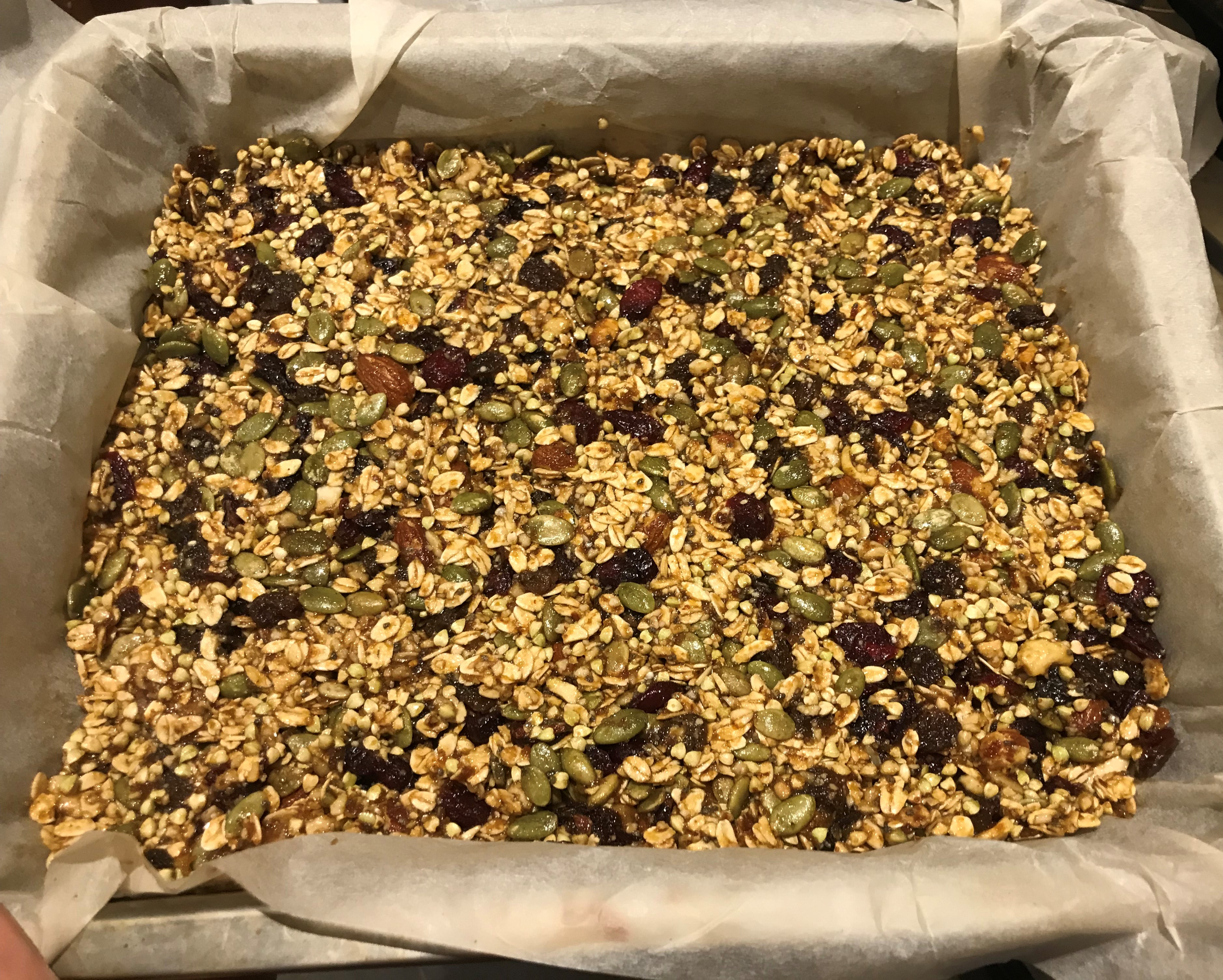 - Once cool, transfer the roasted oats, pumpkin seeds, and nuts to the large mixing bowl with the liquid mix and add the buckwheat groats, raisins, cranberries and chia seeds. Mix well.
