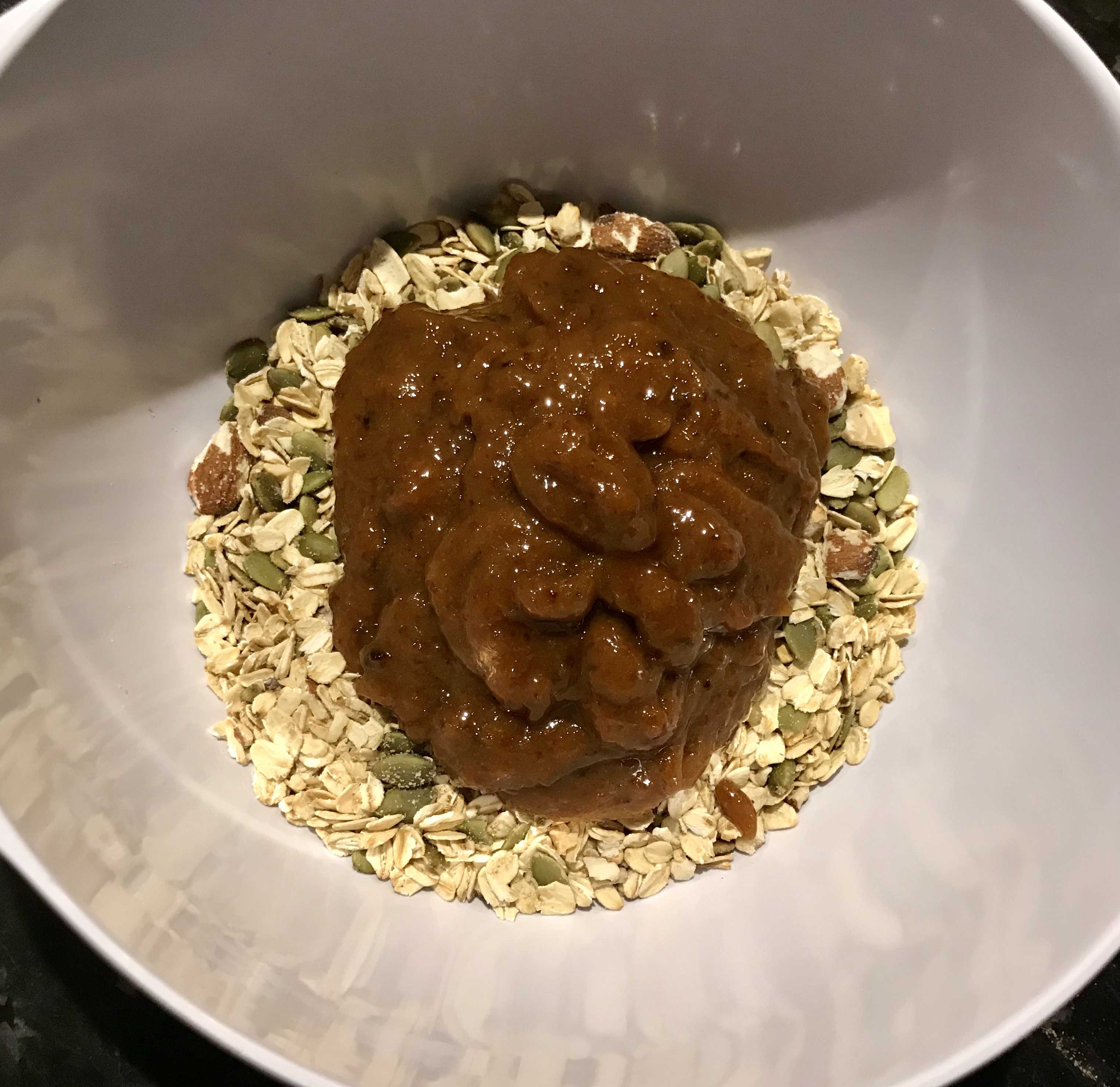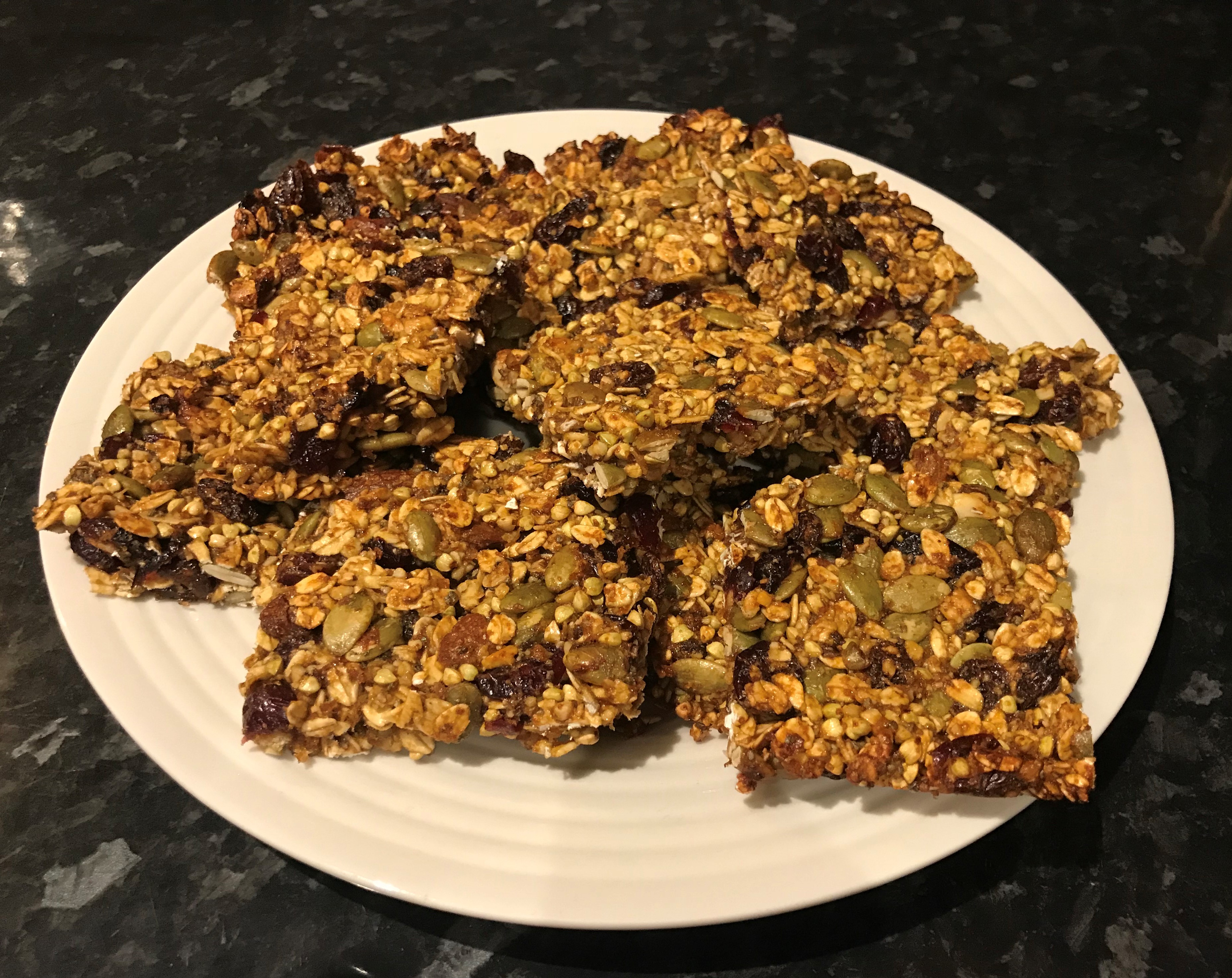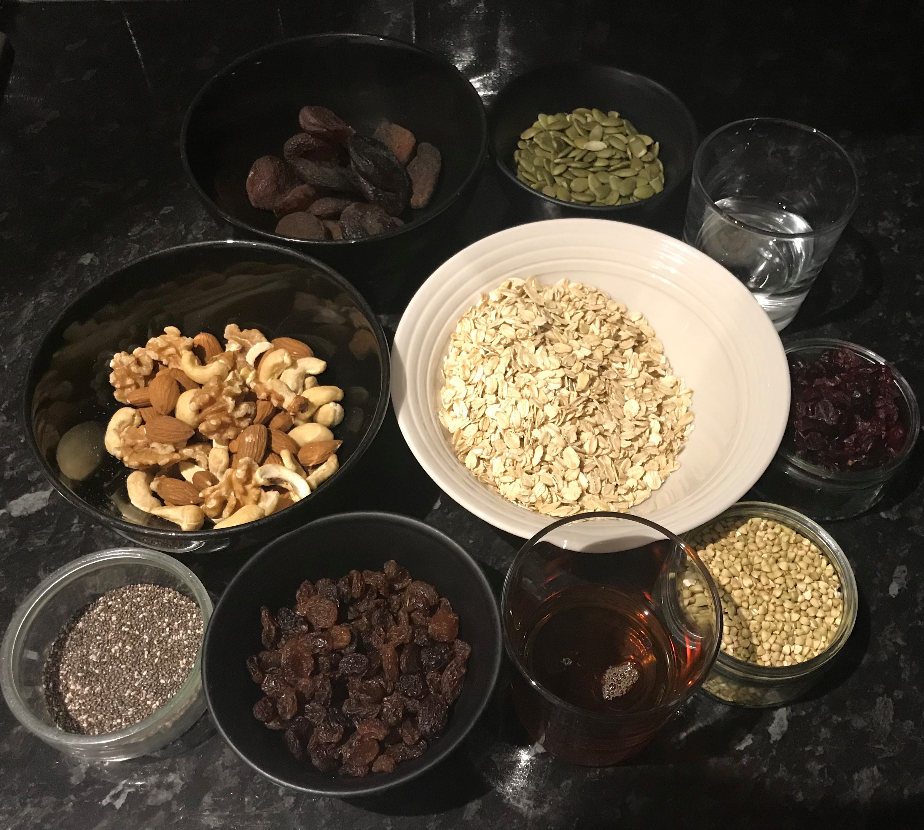 - Once cool, transfer the roasted oats, pumpkin seeds, and nuts to the large mixing bowl with the liquid mix and add the buckwheat groats, raisins, cranberries and chia seeds. Mix well.