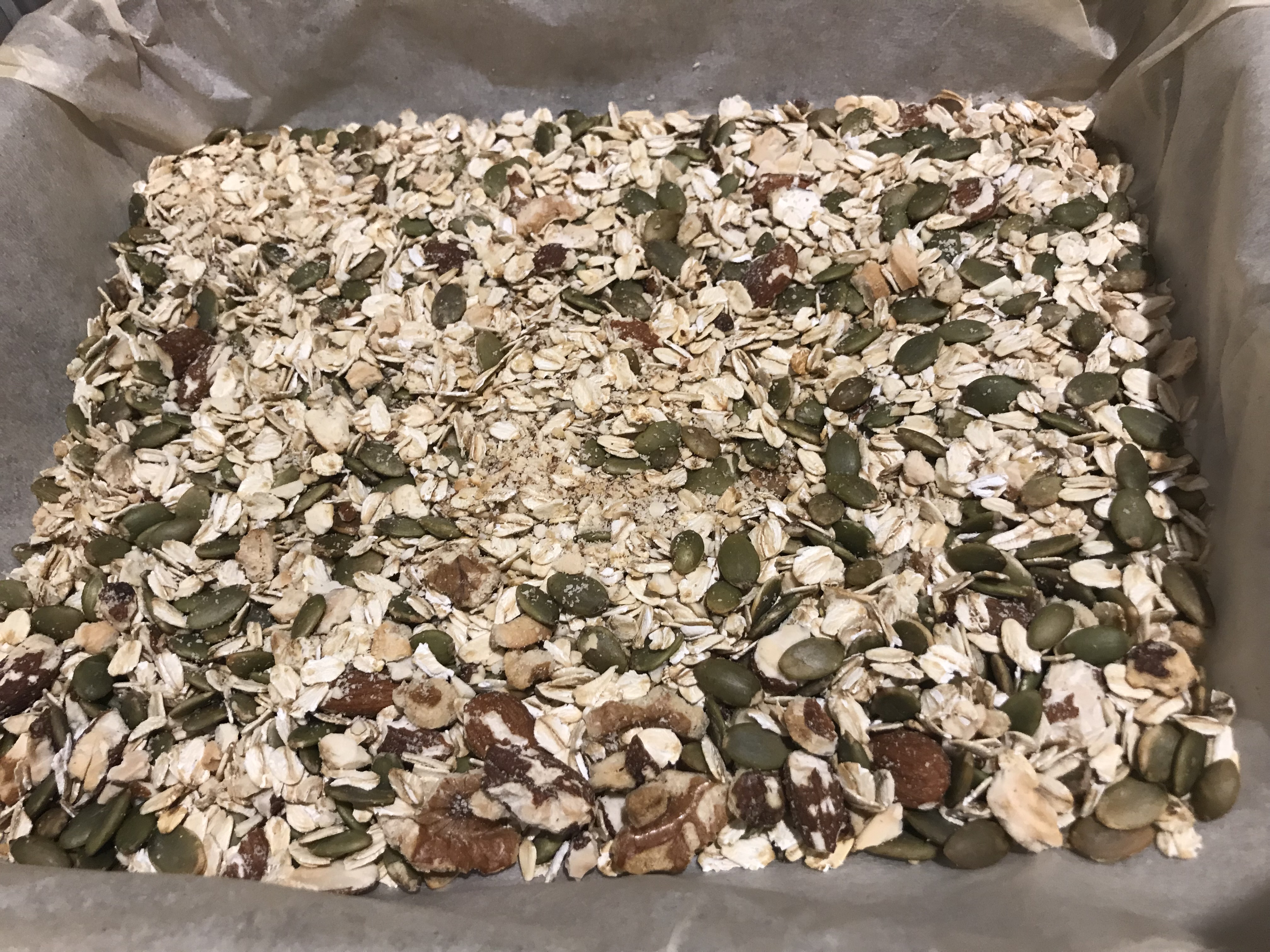 - Spread the oats, pumpkin seeds and nuts evenly over the parchment paper.