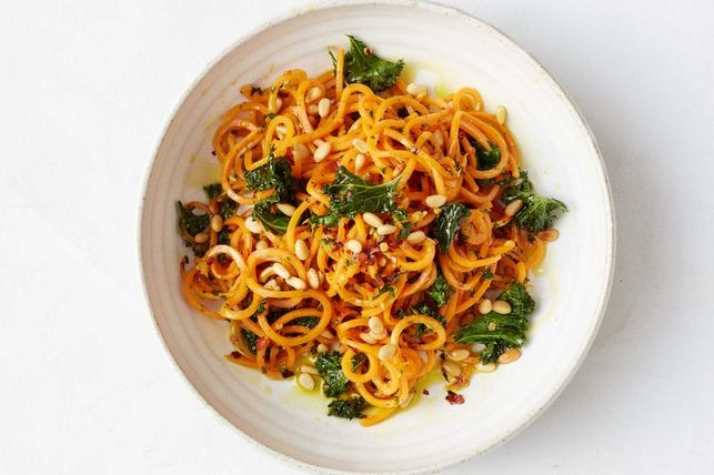 Use a spiraliser to make sweet potato noodles, as an alternative to pasta. These 'swoodles' are combined with garlic, chilli, lemon and crispy kale.