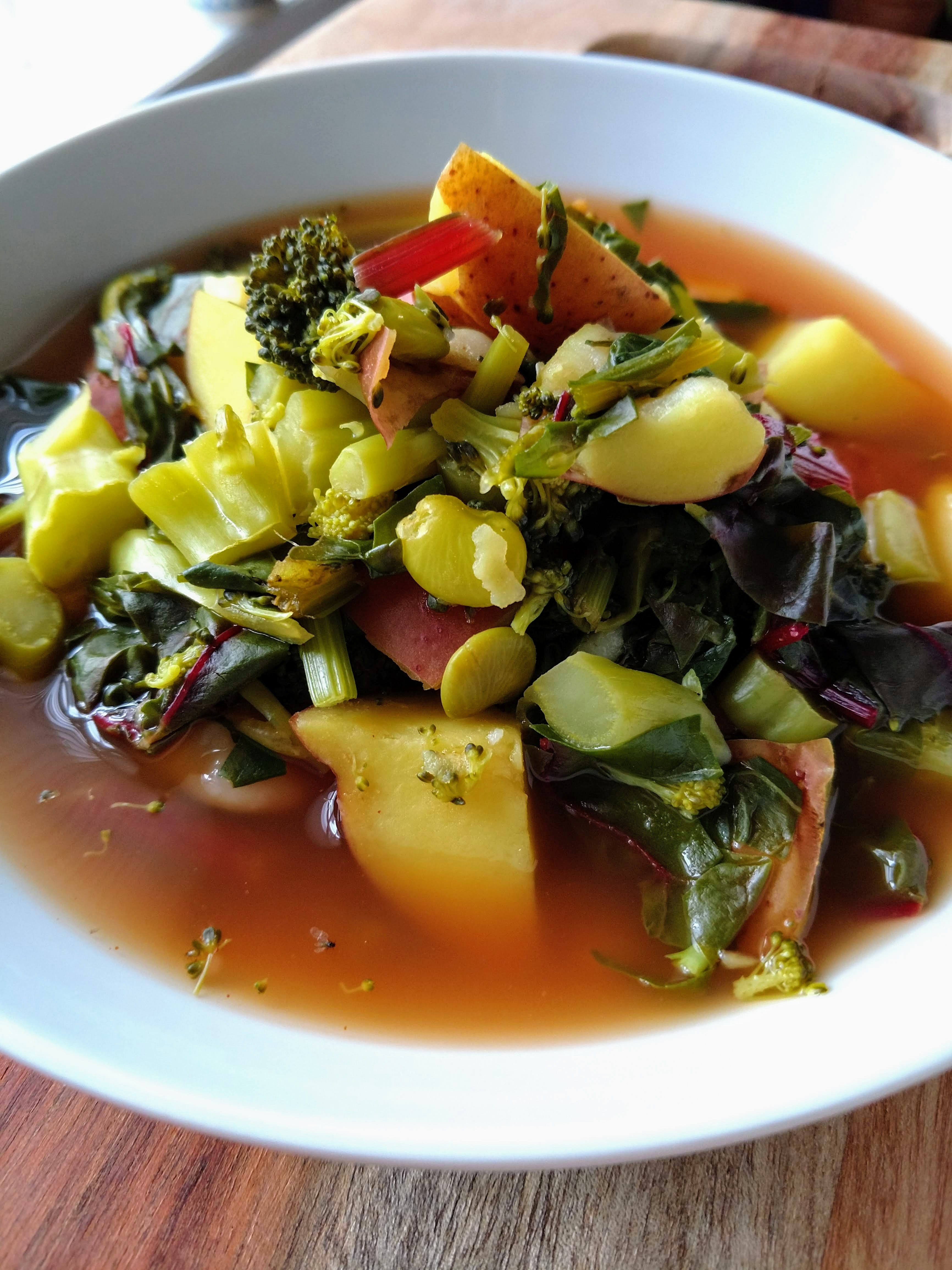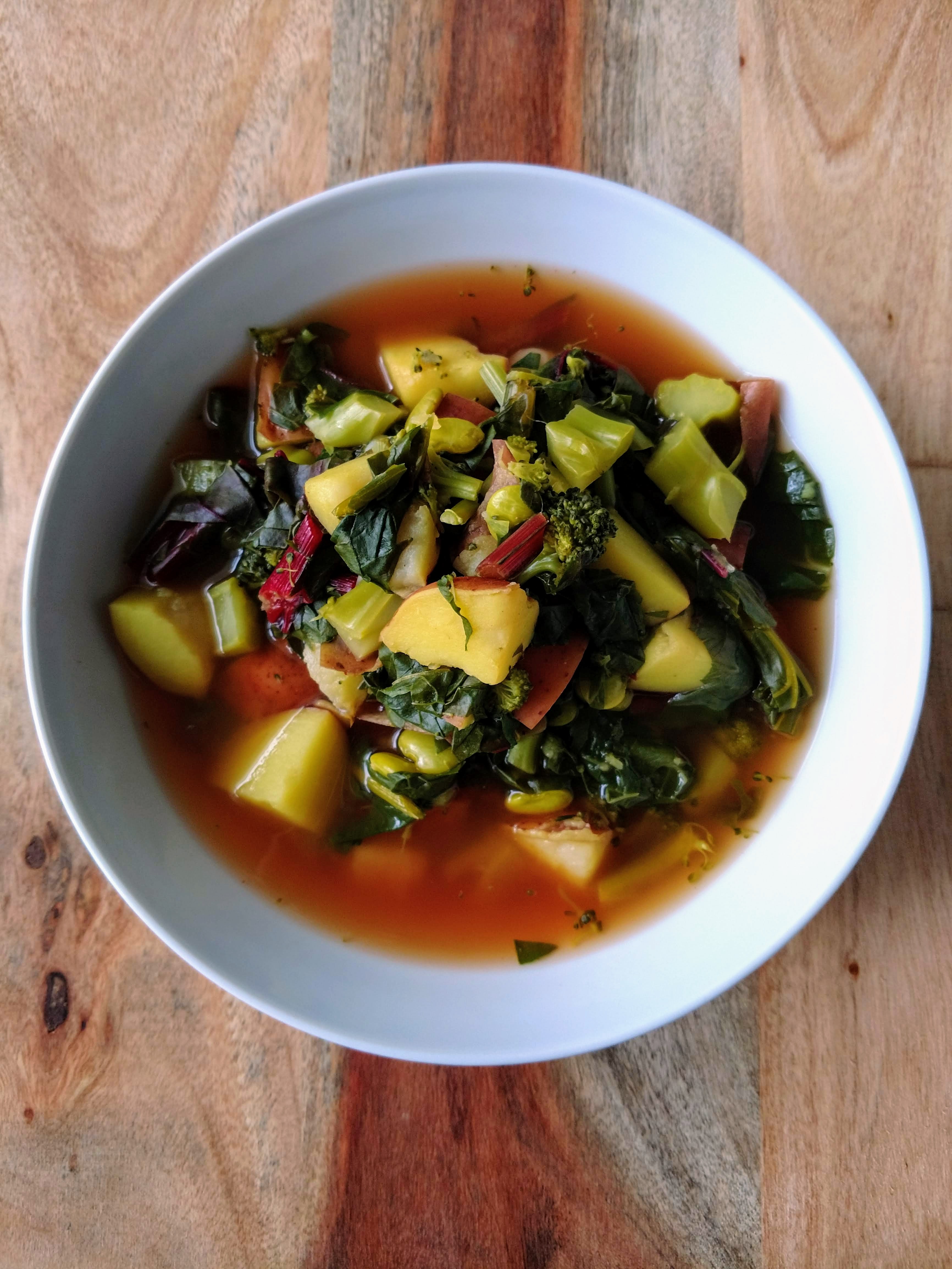 Once the soup is done remove from heat and mix in the chard to let wilt. Mix the miso with a quarter cup of the soup broth so you don't end up with chunks of miso in the soup, then stir in along with the vinegar. Taste and adjust to your liking. Enjoy!