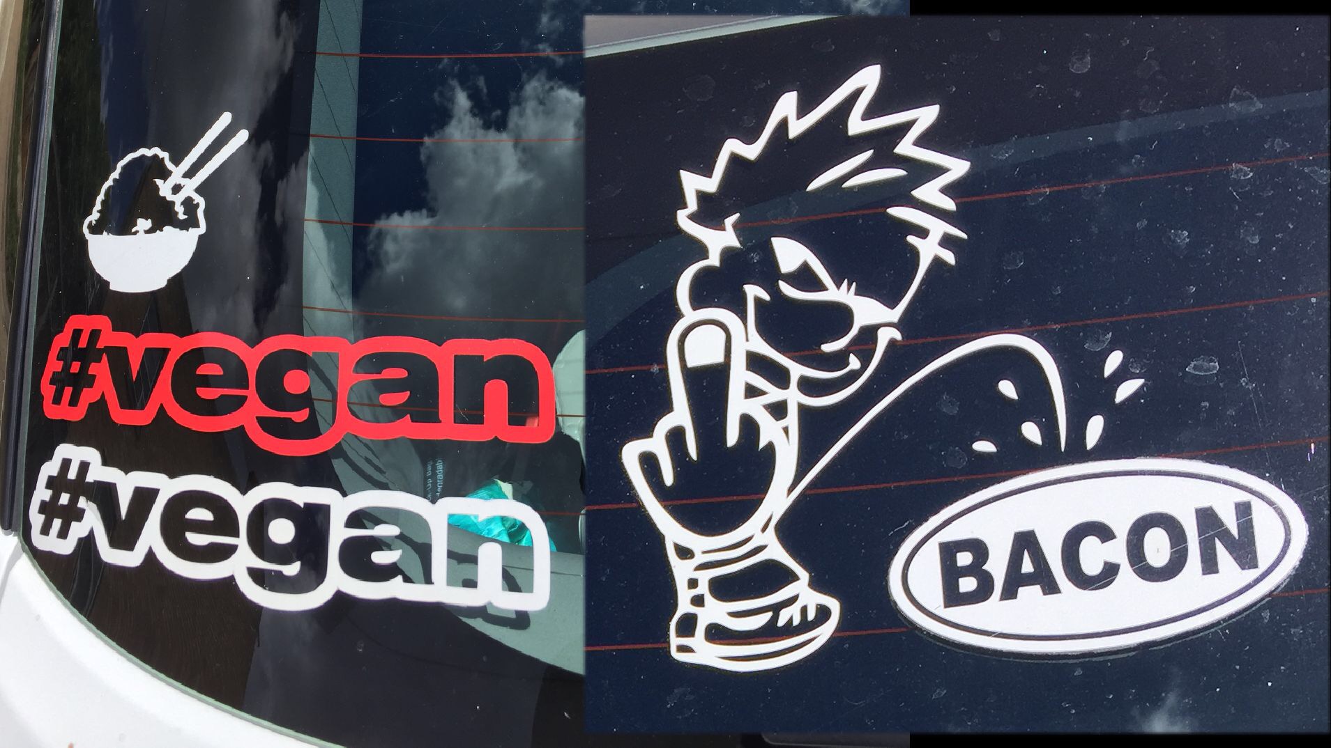 You don't have to be as bold as me, but represent vegans with some of these options. White stickers are the easiest to read on a window.