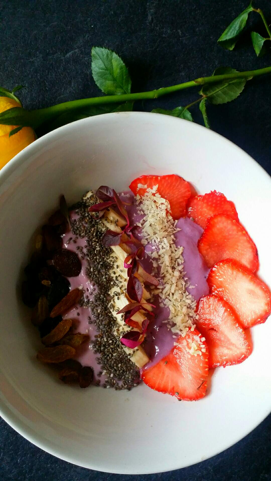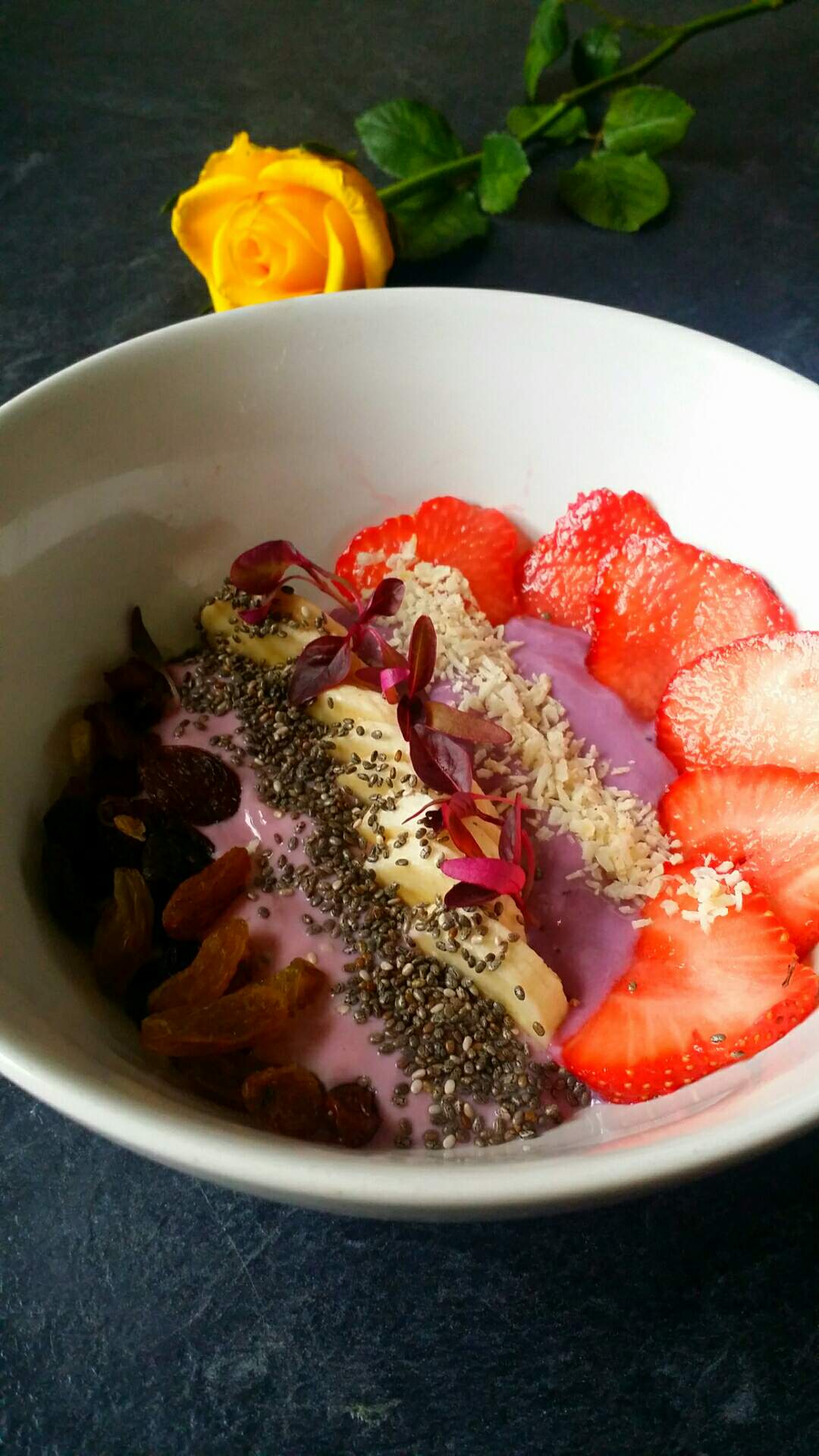 Raspberries soya yogurt, bananas, strawberries, chia seeds, coconuts flakes, raisins, prunes and amaranth