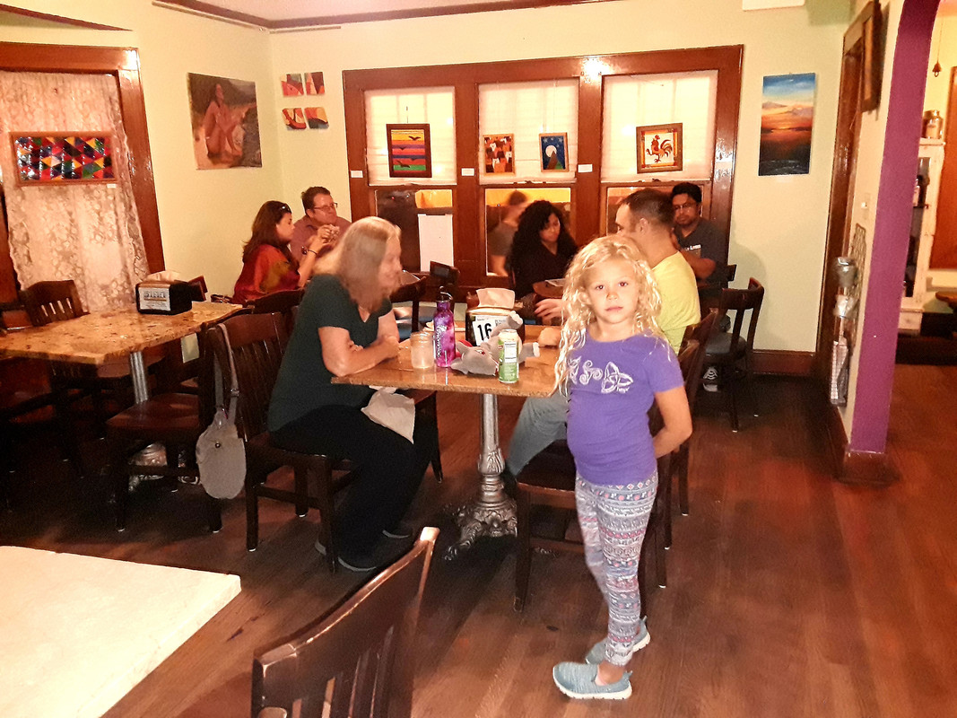 Here's my daughter in front of our table with my mom and @arevolution in the background.