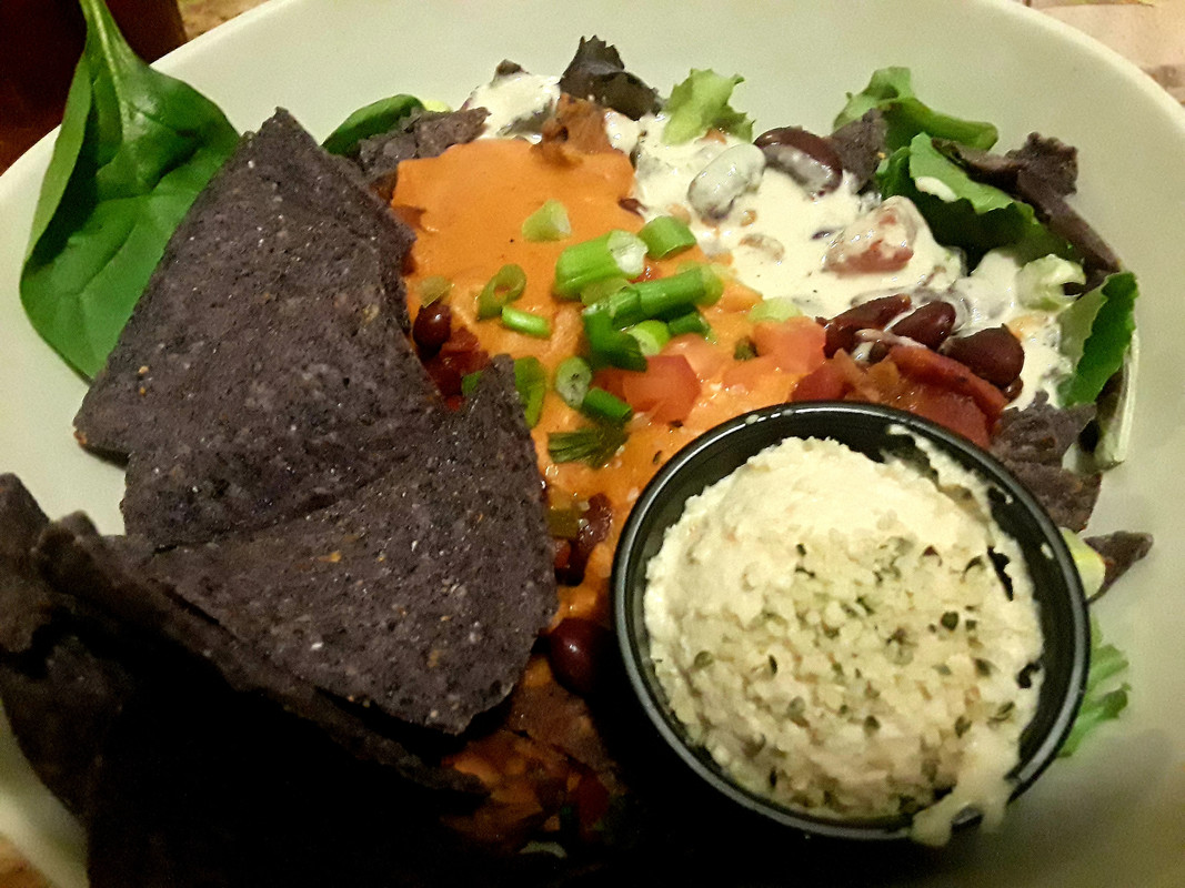 On Mondays they offer a $6 entree called the Giddy Up. It comes as either a bowl or a wrap and is served on a bed of spring mix, grain mix or both. It's topped with vegan chili, nacho cheese and crumbled blue corn tortilla chips, and comes with a choice of sides.