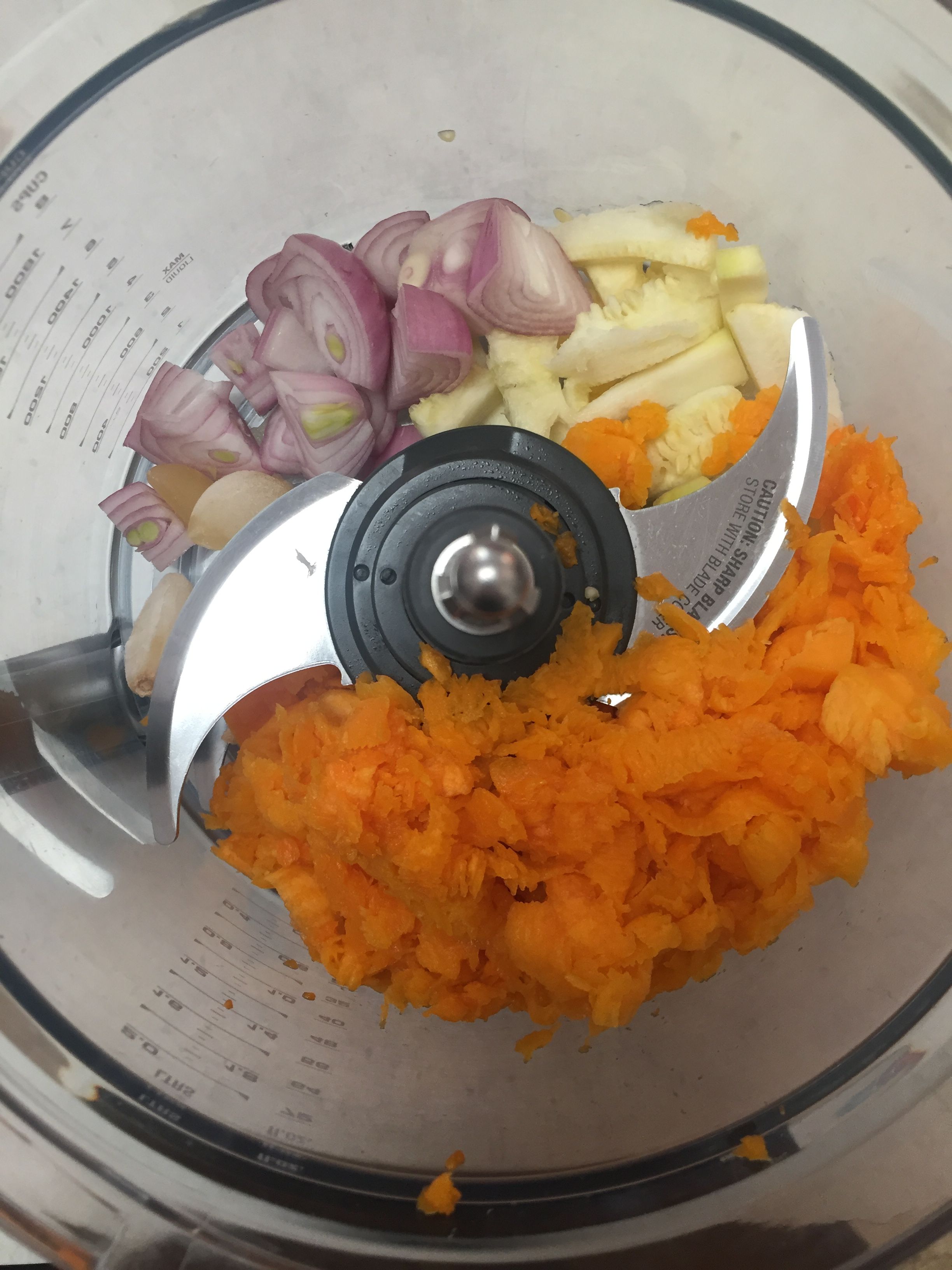 4.Prick the insides of the zucchini and the pumpkin. Process the flesh of the pumpkin and the zucchini with the onion and the garlic