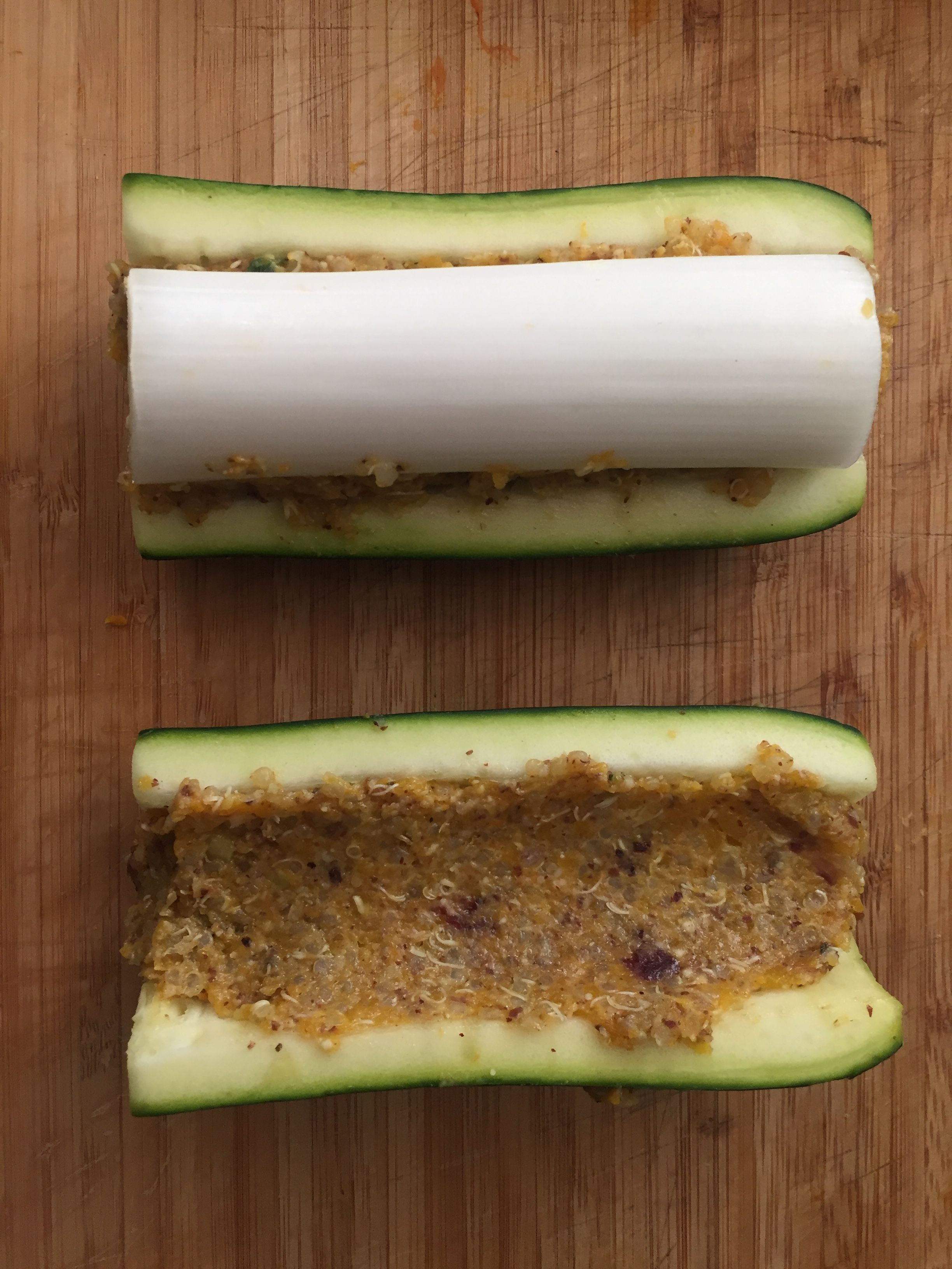 7.Press some of the mixture into the zucchini cavity and press the leek in gently