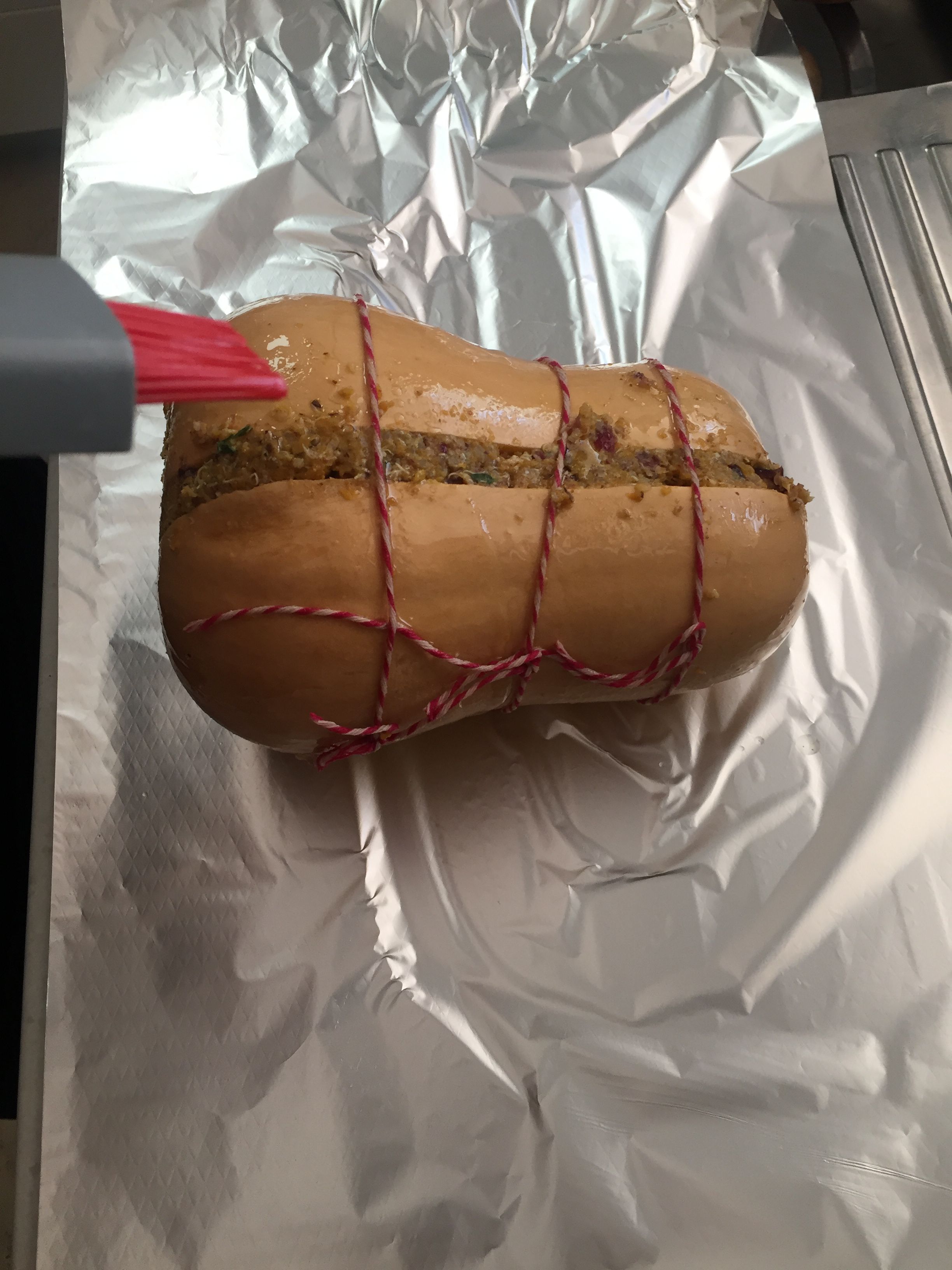9.Tie the pumpkin with cooking string and brush with oil and wrap in foil