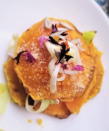 🔸Millefoglie di zucca con cuore di porri, lievito alimentare e decoro di fiori eduli (fiordaliso e tagetes)