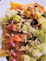 🔸 Zucca e porro al vapore con semi di girasole e fiori eduli.