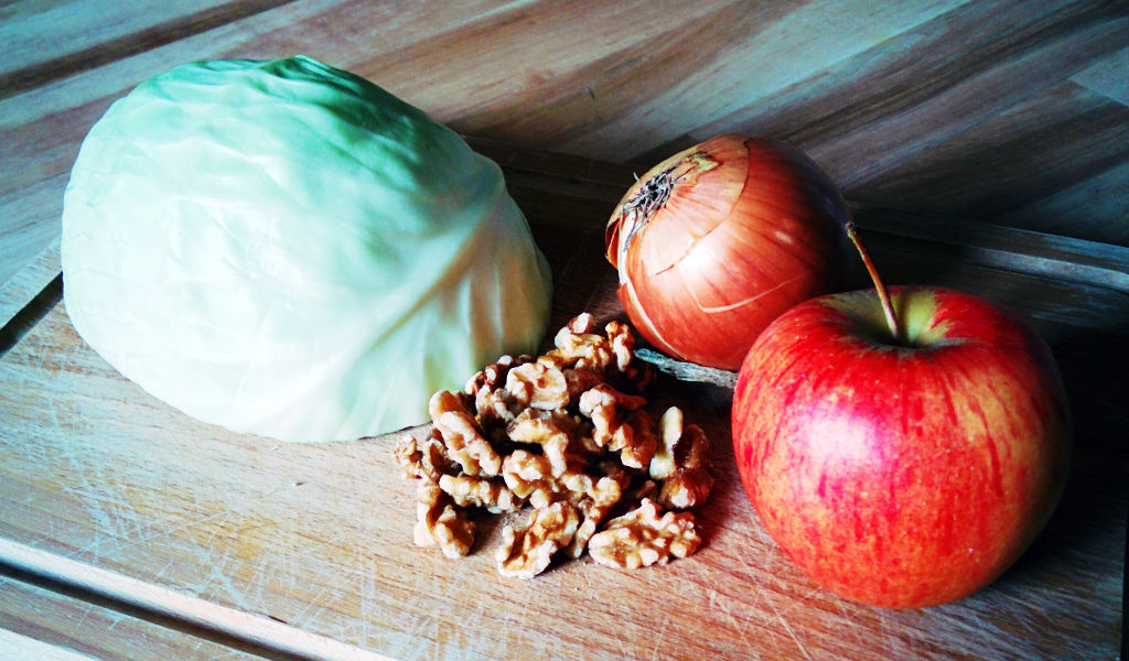 It’s that time of the year when everyone gets the flu. Luckily there are tons of cabbages right now at the market. We Germans make our famous Sauerkraut from those. They are high in vitamin C which boosts your immune system, so you want to eat lots of them! My seven year old son does not eat green things. He does, however, eat brown, white or red things, even if they crunch and taste like vegetable. So this salad is perfect to bolster his immune system during winter. Let's get started.