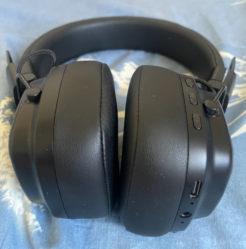 Aquí una foto de los audífonos tipo casco inalámbricos. Estos poseen diversos botones para controlar la música y radio así como una ranura de memoria micro SD y carga USB tipo C. También tiene orejeras y cubierta de cuero.