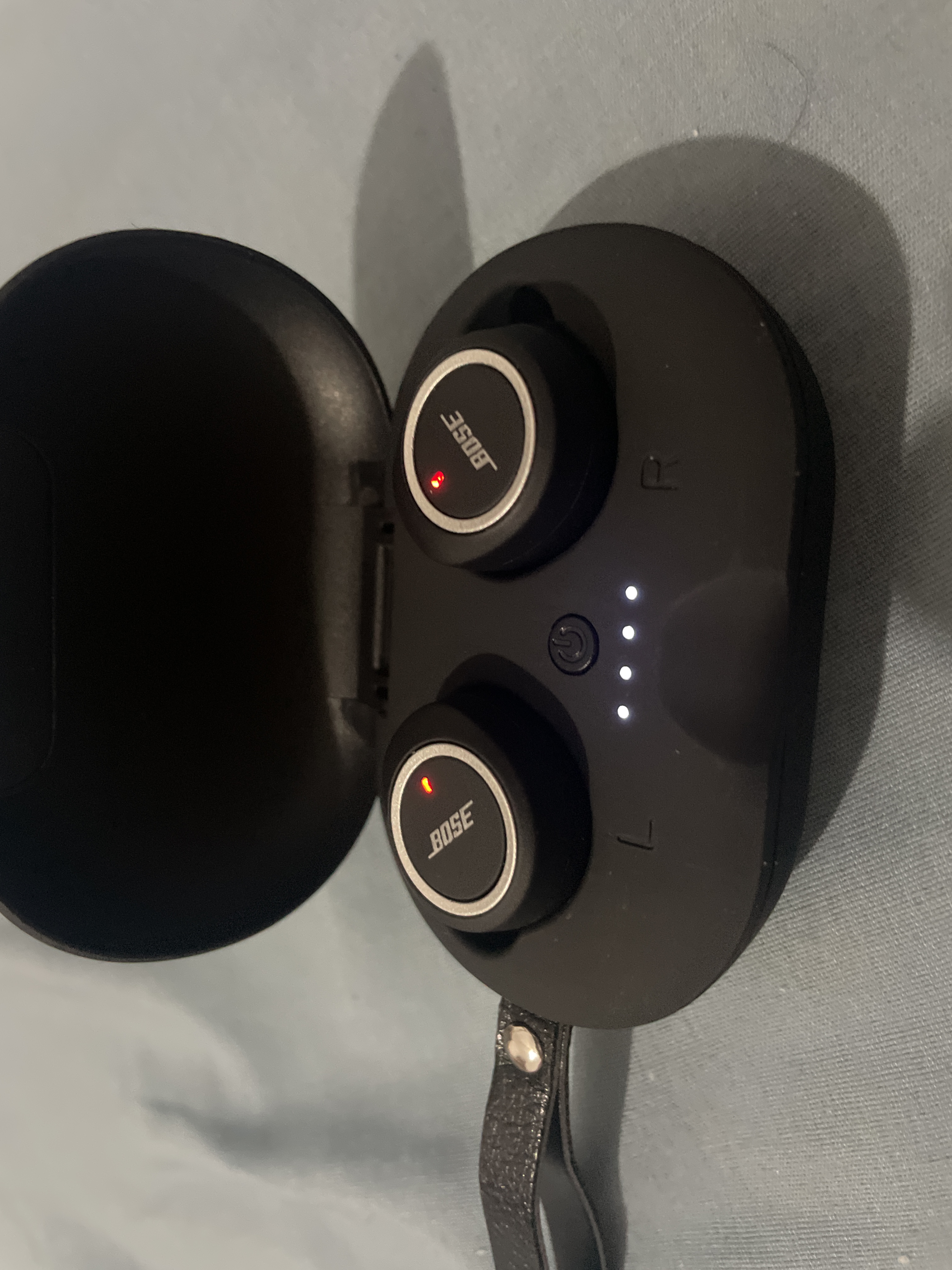 Aquí tenemos una foto de audífonos inalámbricos tipo botón. Se colocan en los oídos y cada uno tiene batería independiente que se carga en un estuche que a su vez, se conecta a un cable USB tipo C. El estuche indica el nivel de carga de la batería y de los auriculares.